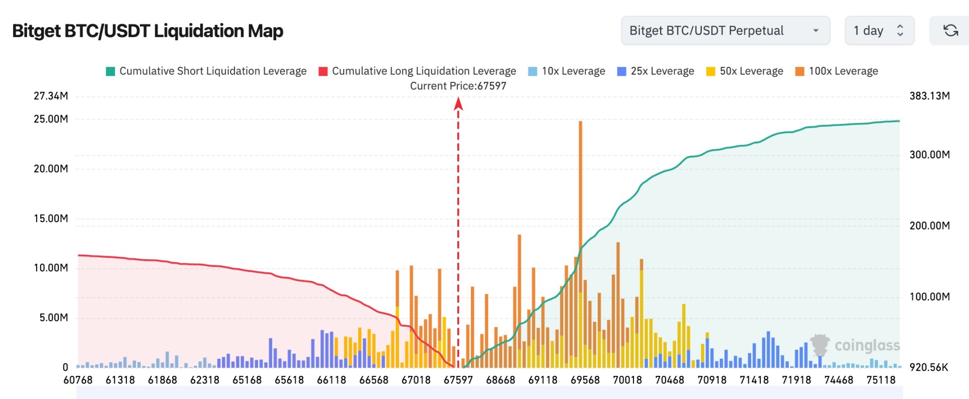 Bitget BTC/USDT 清算地图:当前价格约 67,600 美元,下方多头清算已明显减少,而 68,500–70,000 美元上方聚集大量空头清算杠杆,短线更容易出现向上扫空的行情。若价格继续站稳 67,000 美元并上破 68,500 美元,可能触发空头挤压推动反弹扩大。