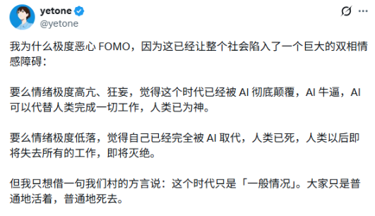 正如 AI 开发者 @yetone 在社交媒体上直言不讳:“我极度恶心 FOMO,这已经让整个社会陷入了一个巨大的双相情感障碍:要么情绪极度高亢,认为人类已为神;要么情绪极度低落,觉得人类已死。”