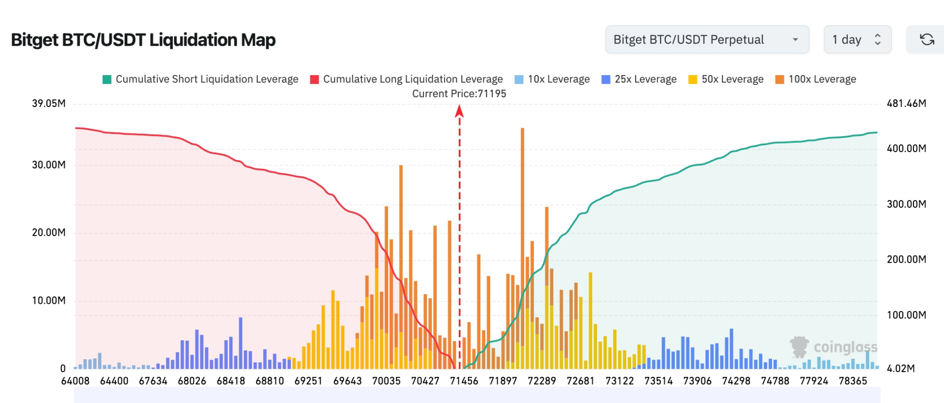Bitget BTC/USDT 清算地图:当前价格约 71,195,下方多头清算区已经明显减少,而上方 71,800–73,000 一带仍存在大量高杠杆空头清算集中区,短线更容易触发向上挤空。整体结构呈现 上方流动性明显强于下方支撑,价格若继续震荡,倾向优先测试上方清算密集区。