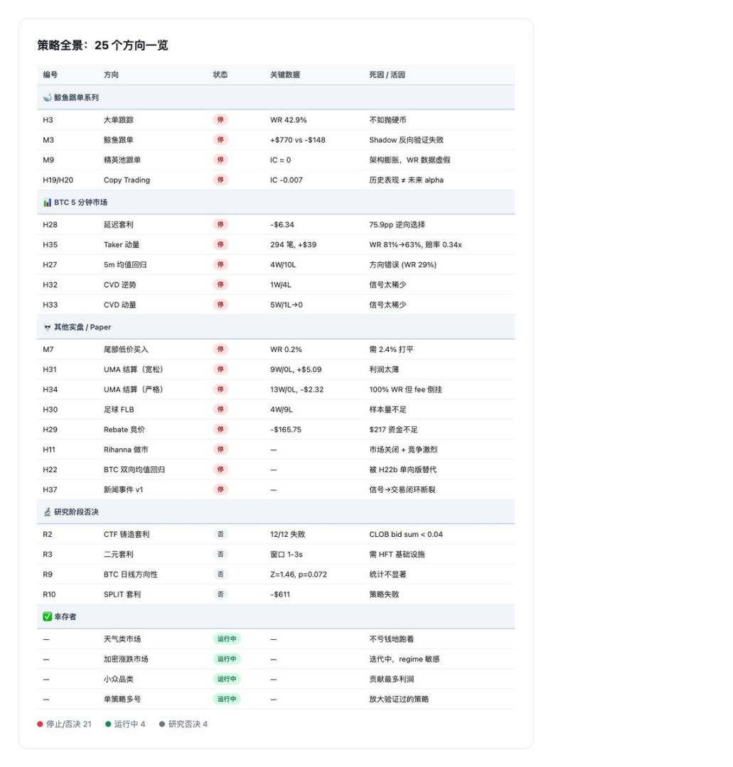 但比起刚开始的时候,已经好太多了。最早连一个策略都跑不通,现在至少有几个能稳定运行的方向。这些「尸体」教会我的东西——关于市场效率、成本结构、数据幻觉——是教科书里读不到的。每停掉一个策略,就比上一次更清楚什么能做、什么不能做。