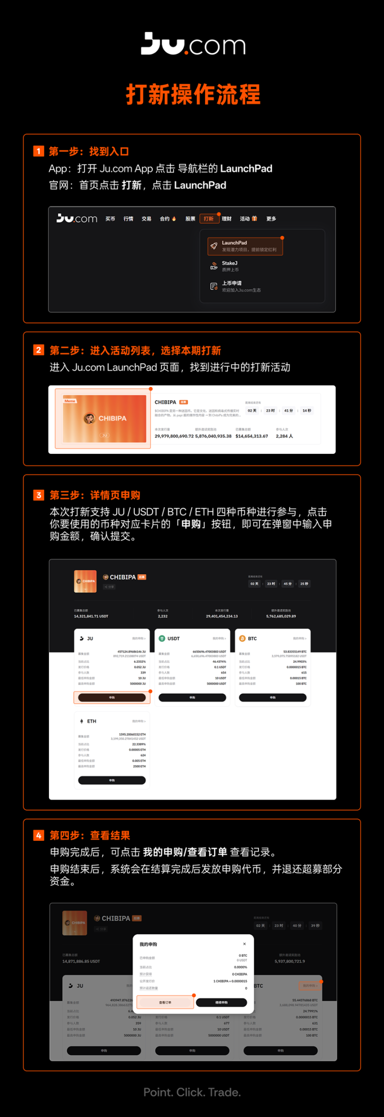 • 准备认购资产:每期支持的认购币种 / 入口以当期页面展示为准(示例:JU / USDT / BTC / ETH 等)。