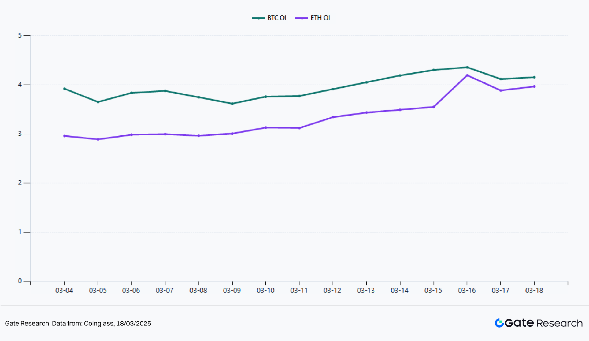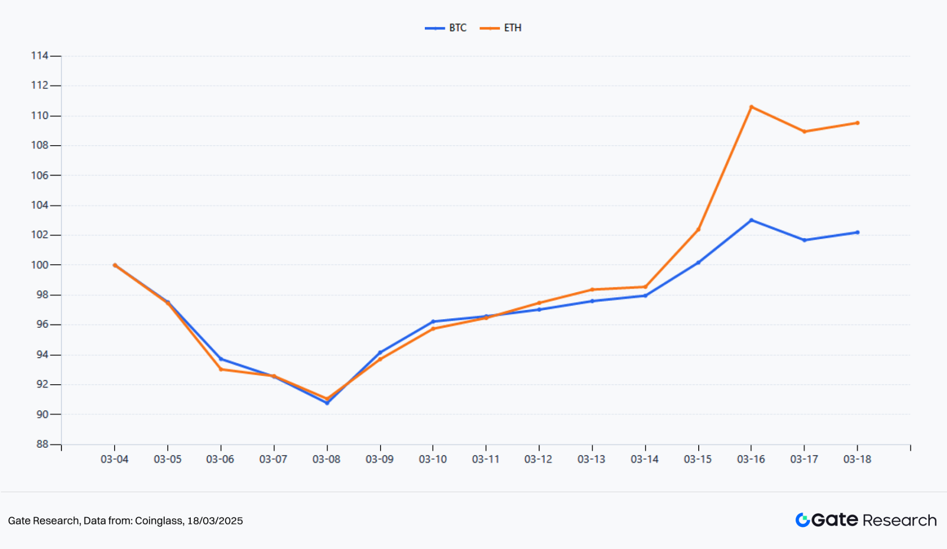 核心变化是结构切换,而非单纯反弹。3 月上旬市场先完成一轮去杠杆,BTC 先稳住结构,ETH 随后接力放大弹性。衍生品数据对此的验证非常明确:BTC 永续未平仓量两周仅增加约 5.97%,ETH 却增加约 33.99%。这说明 BTC 当前更像趋势锚,ETH 则更像风险偏好回暖后的进攻腿。