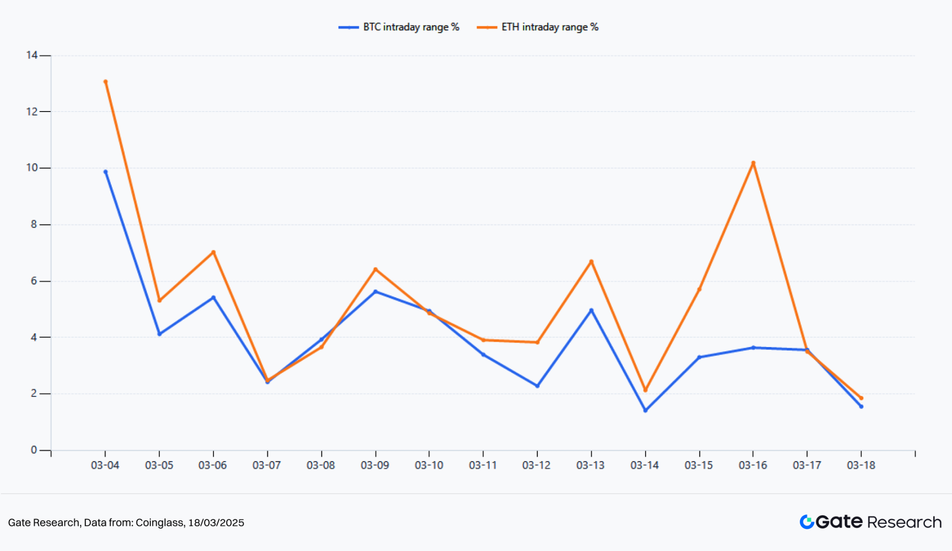 从波动率角度看,BTC 与 ETH 的价格运行都呈现出先压缩、后释放的节奏,但 ETH 的波动弹性明显更强。BTC 由 72,681 美元震荡回升至 74,276 美元,区间涨幅约 2.2%;ETH 由 2,127 美元升至 2,329.9 美元,区间涨幅约 9.5%。若以日内高低点衡量真实波动,BTC 在过去两周的平均日内振幅约为 4.03%,峰值达到 9.88%;ETH 的平均日内振幅约为 5.38%,峰值达到 13.08%。在本轮修复中,BTC 承担着价格中枢修复的角色,而 ETH 则明显进入波动放大后的趋势跟随状态。