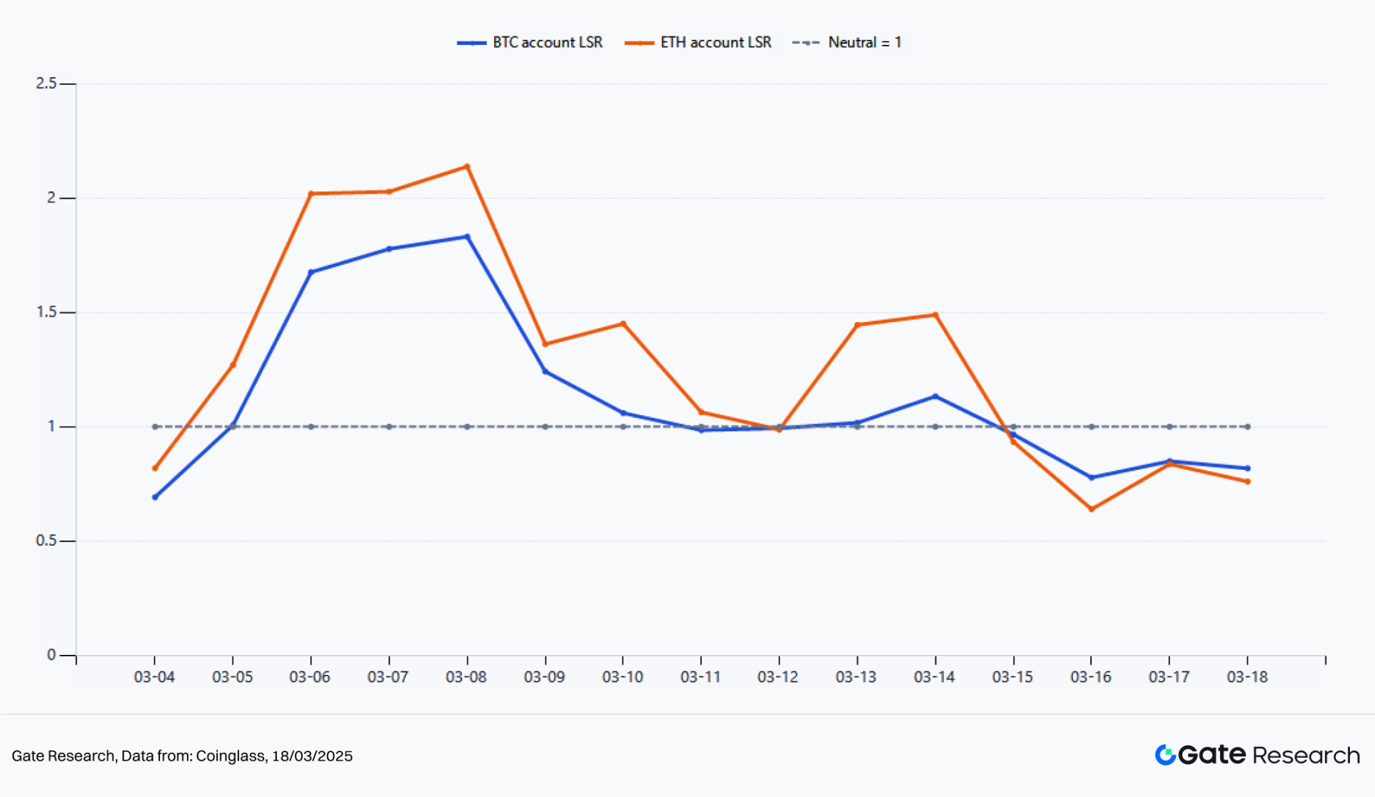 不过,随着价格重新企稳,LSR 并没有继续抬升,反而持续回落。截至 3 月 18 日,BTC 与 ETH 的账户多空比分别降至 0.818 与 0.760,重新回到 1 以下。这一变化并不代表市场已经转空,相反,它说明这轮上涨并不是依赖普通账户持续追多推动,而更像是空头被动平仓与现货增量共同驱动的结果。换言之,散户账户的追高意愿在下降,但价格仍能维持高位,市场结构依旧偏强。若后续 LSR 再次低位抬升,而价格同步突破前高,则往往意味着新一轮顺势资金正在入场。