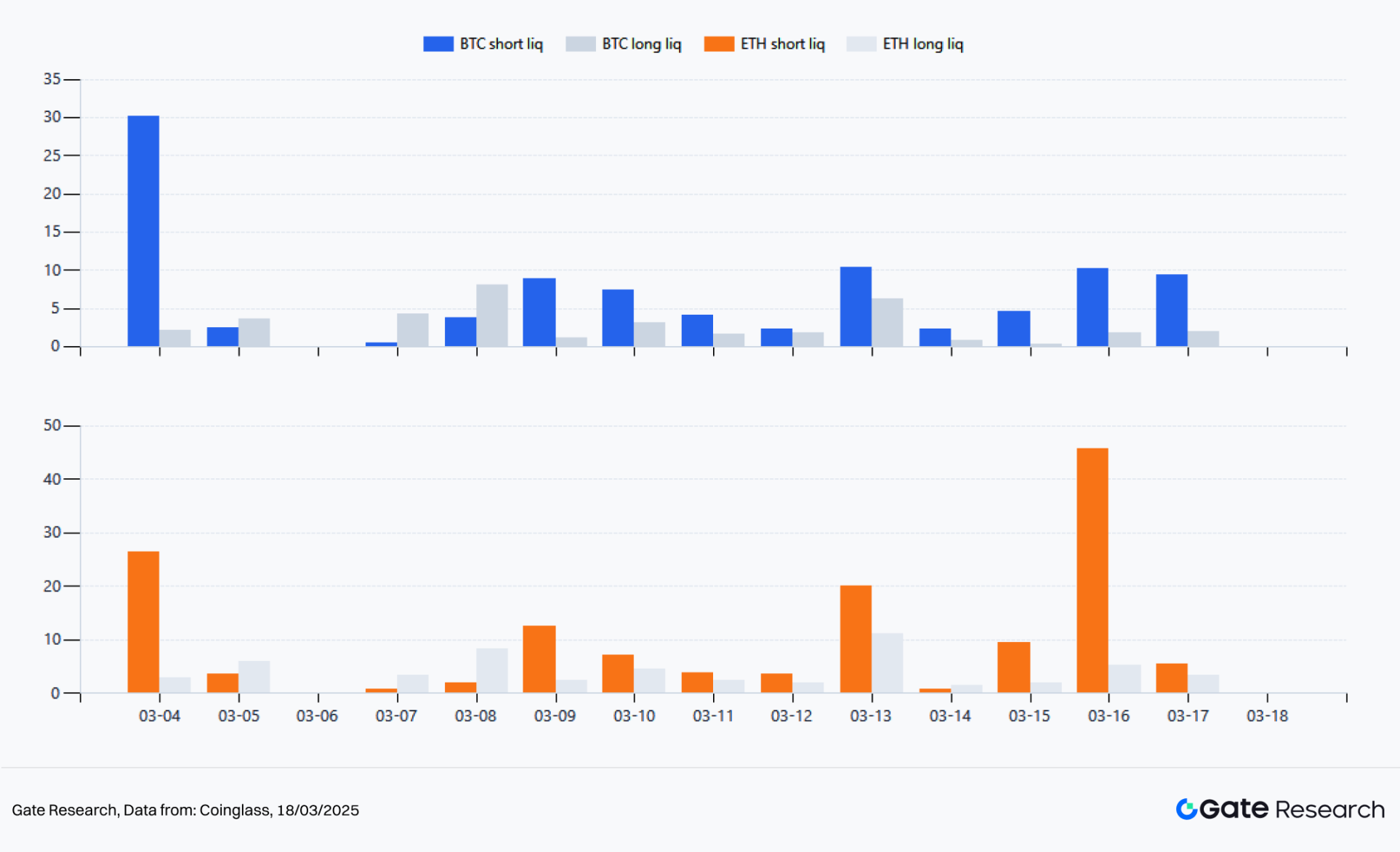 若观察单日结构,BTC 在 3 月 4 日与 16 日的空单清算最为集中,分别约 3,018 万美元与 1,016 万美元;ETH 则在 3 月 13 日与 16 日出现更剧烈的空头清算,其中 16 日单日 ETH 空单爆仓达到约 4,564 万美元。这组数据验证了当前行情的典型特征:BTC 先完成方向确认,ETH 再通过更强的空头回补与杠杆放大实现收益扩张。对市场而言,这类爆仓结构通常比多头高位集中爆仓更偏积极,因为它意味着上涨更多是挤空推动,尚未形成系统性多头拥挤。只要后续爆仓没有转为多单主导,趋势大概率仍处在相对健康的延续阶段。