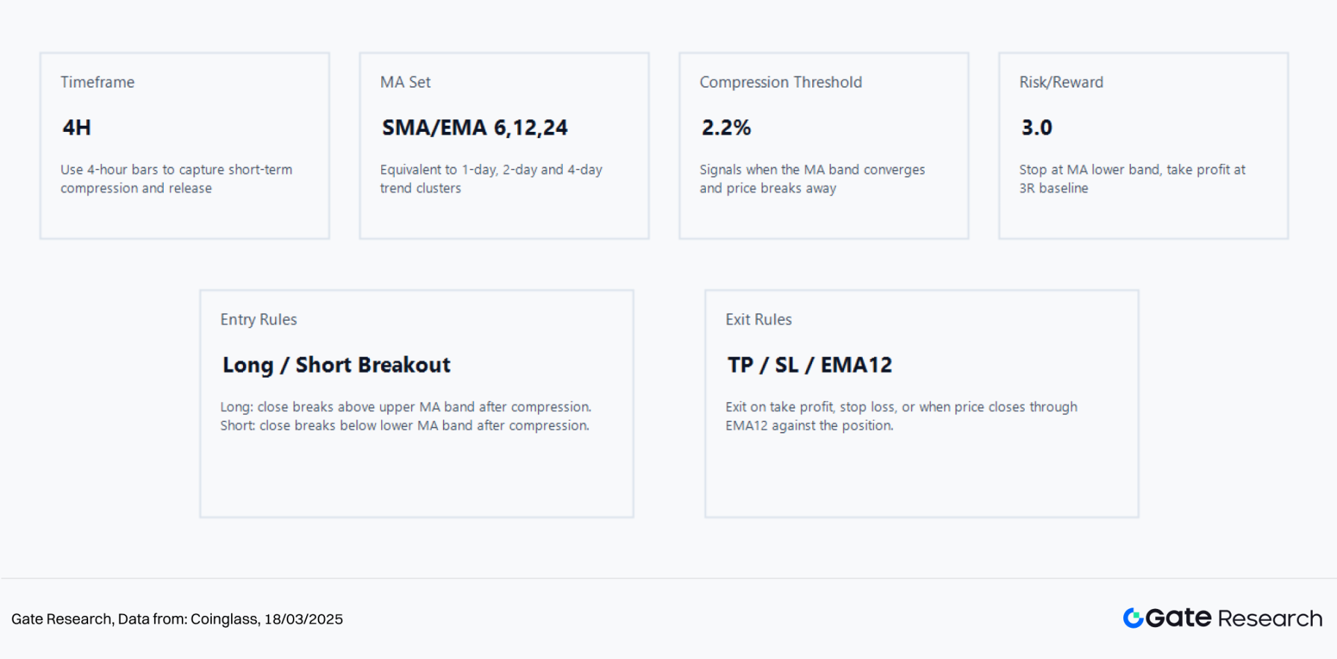 本次量化分析采用 4H 级别数据,均线簇使用 SMA/EMA 6,12,24 的组合,分别对应约 1 天、2 天和 4 天的短中期趋势。基准参数设为压缩阈值 2.2%、收益风险比 3.0,这组设置的优点是信号足够灵敏,又不会因为阈值过宽而纳入过多噪声。相比于一般的通用框架,此处更强调短周期实盘监测,因此参数被有意识地缩短,以更贴合近期的节奏切换。