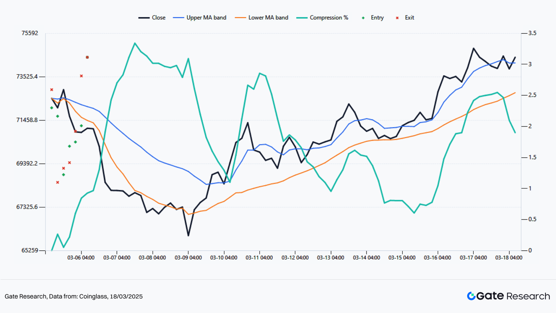 过去两周的市场结构更适合趋势突破,而不适合简单的均值回归。原因在于:一方面,3 月上旬的快速去杠杆让短中期均线重新收敛;另一方面,ETF 资金回流、资金费率未过热、空头连续回补,使得价格在压缩后更容易沿突破方向延续。