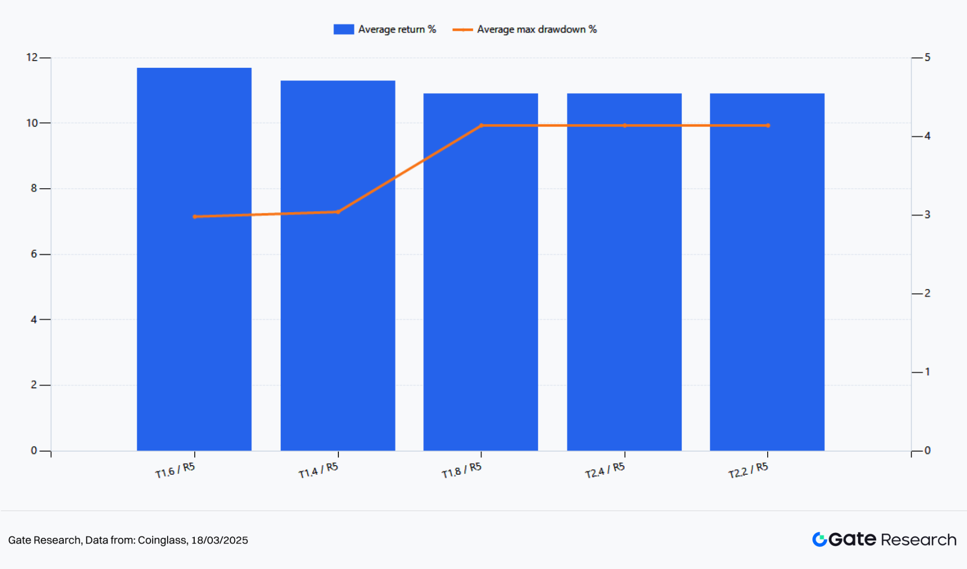 为了避免只看单一参数下的偶然结果,本次对压缩阈值 1.4%-3.0% 和收益风险比 2.0-5.0 做了网格扫描,并以 BTC 与 ETH 两个资产的平均收益作为排序依据。结果显示,排名前五的参数簇几乎全部集中在阈值 1.4%-2.4% 与收益风险比 5 附近,其中最优组合为 T1.6 / R5,BTC 两周策略收益约 11.41%,ETH 约 11.94%,平均收益达到 11.68%,平均最大回撤仅 2.98%。这说明当前市场最赚钱的不是放宽条件或者多做交易,而是收紧压缩阈值、让利润奔跑。