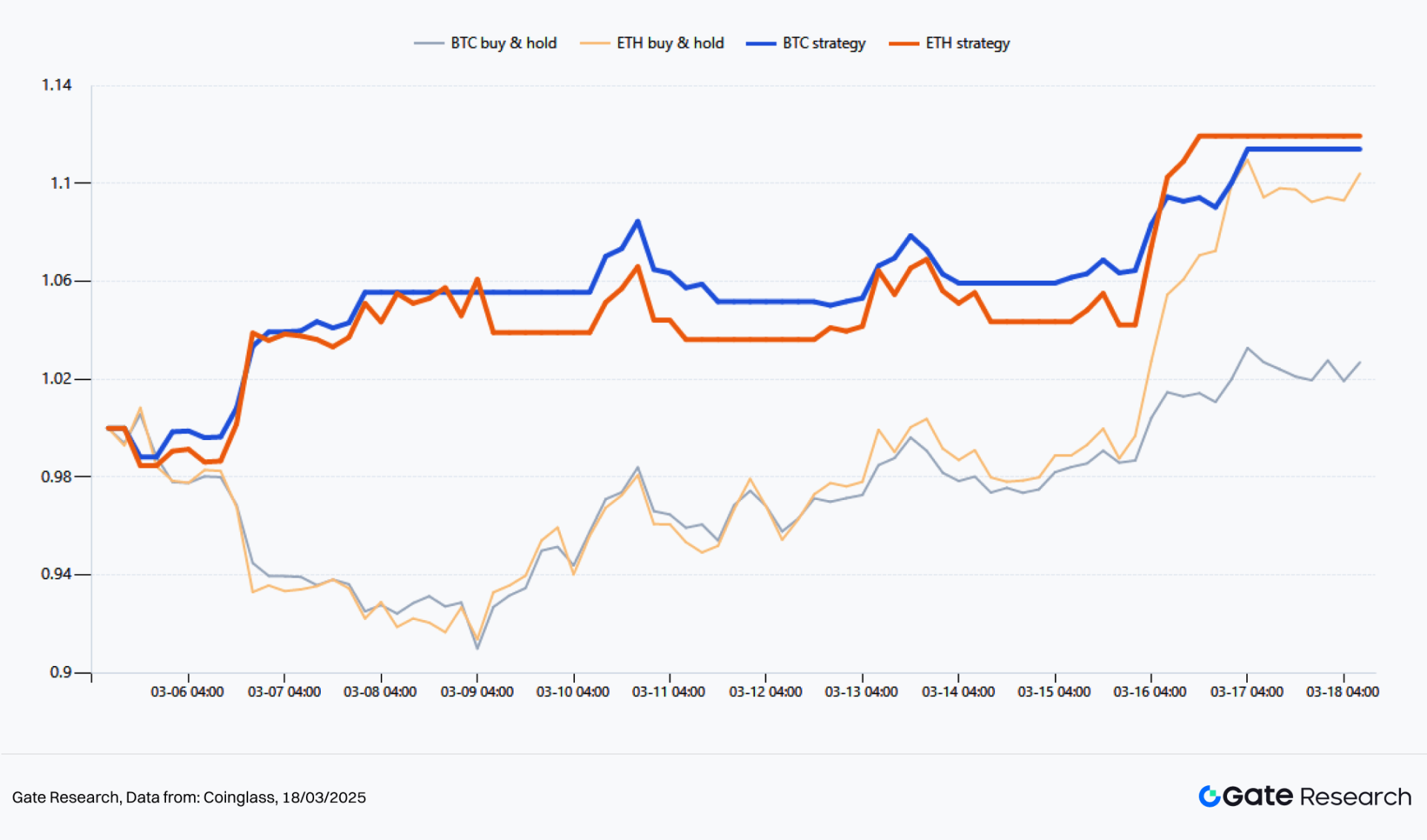 进一步比较最优参数簇与现货持有,可以看到策略净值在 BTC 与 ETH 上均跑赢对应的买入并持有。过去两周,BTC 现货区间涨幅约 2.2%,但最优参数簇策略收益约 11.41%;ETH 现货区间涨幅约 9.5%,策略收益约 11.94%。BTC 的超额收益更显著,因为模型不仅抓住了后续上行,也有效利用了 3 月上旬的短空段;ETH 则在保留大部分上涨收益的同时,尽量规避了中间的回落波动。对比来看,这套策略在当前市场环境下最大的价值,不是绝对抓顶抄底,而是把趋势的有效区段提取得更干净。