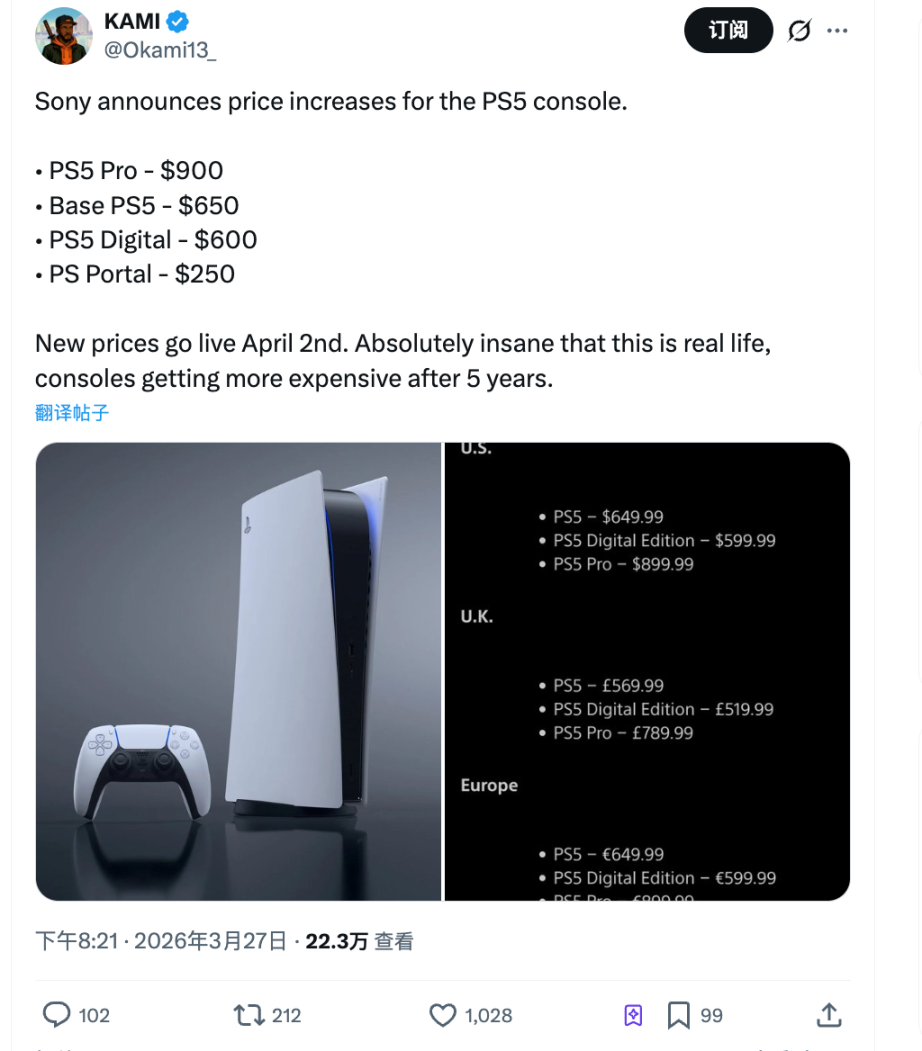 3 月 27 日,索尼宣布 PS5 全线涨价,4 月 2 日生效。
