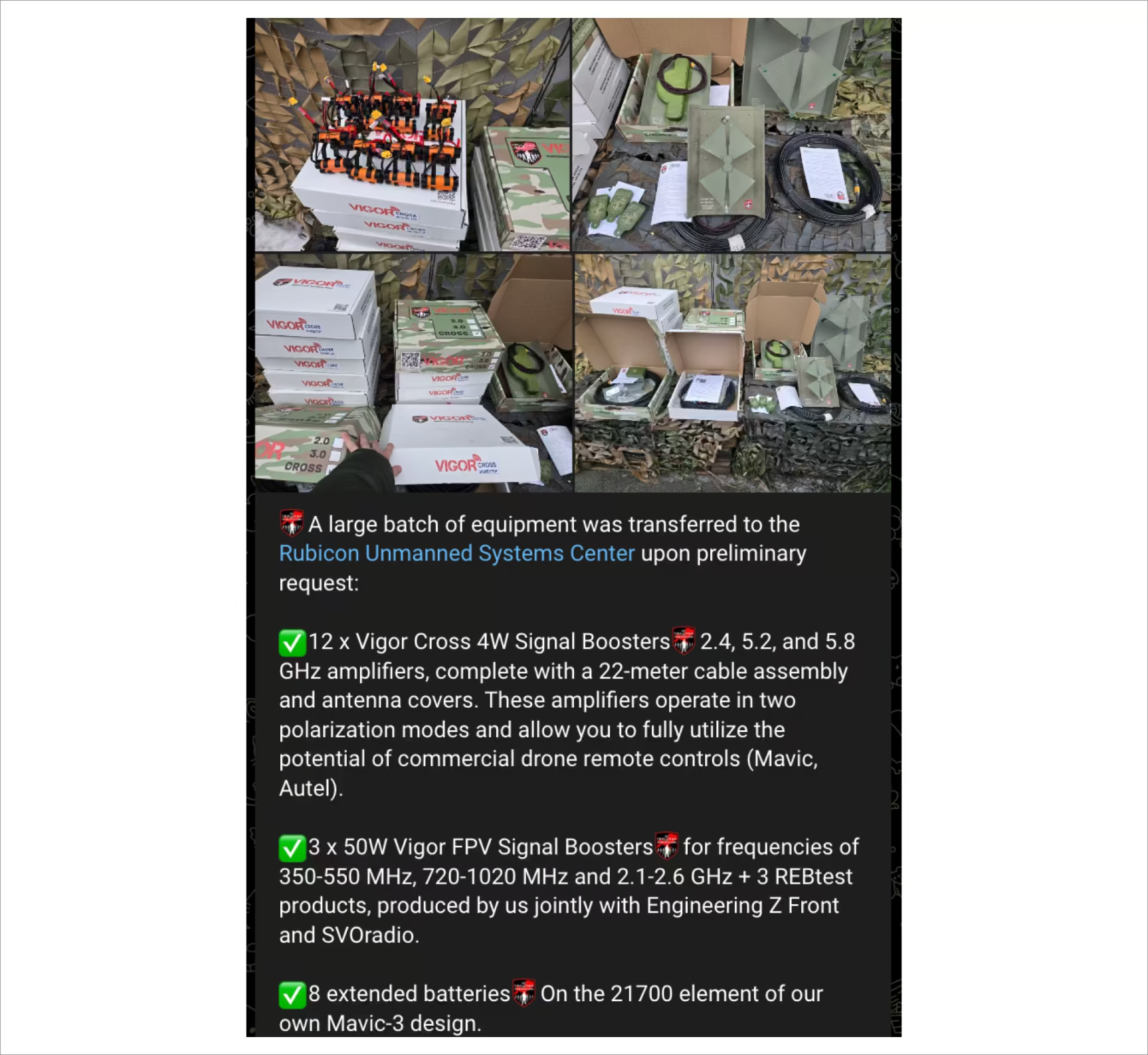 加密与无人机关联最为公开可见的表现形式,存在于民兵层面,具体体现为在社交媒体平台上发起的公开众筹活动。自 2022 年俄罗斯全面入侵乌克兰的最初几个月起,我们识别出数十个亲俄的志愿者及准军事组织,他们通过募集加密货币捐款来购买军事装备。这些团体共计筹集了超过 830 万美元的加密资产。无人机被明确列为采购项目之一。一则募捐帖子描述了一次旨在筹集足够卢布以购买一架侦察无人机的活动。另一则帖子发布了一份交货清单,其中包含价值约 20 万卢布(约合 3400 美元)的无人机零部件,以及无线电设备、医疗用品和武器清洁工具。