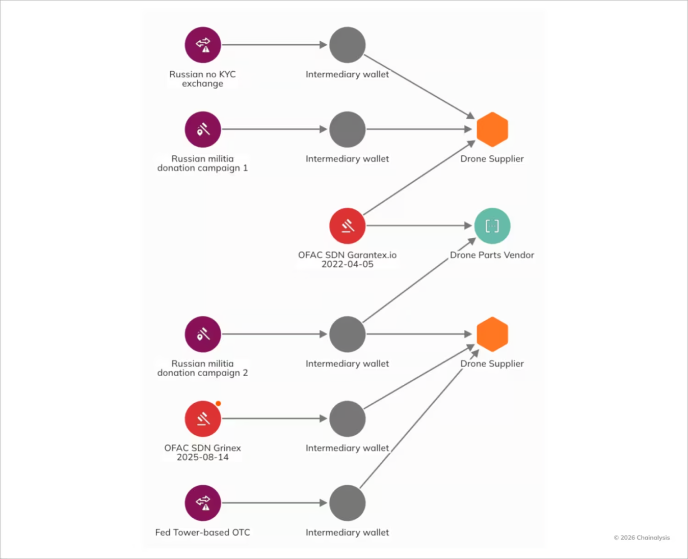 观察到两个俄罗斯民兵捐款活动钱包通过中间方进行无人机采购。其他购买无人机的钱包在上游环节与受制裁的俄罗斯交易所及其他俄罗斯相关服务存在关联。