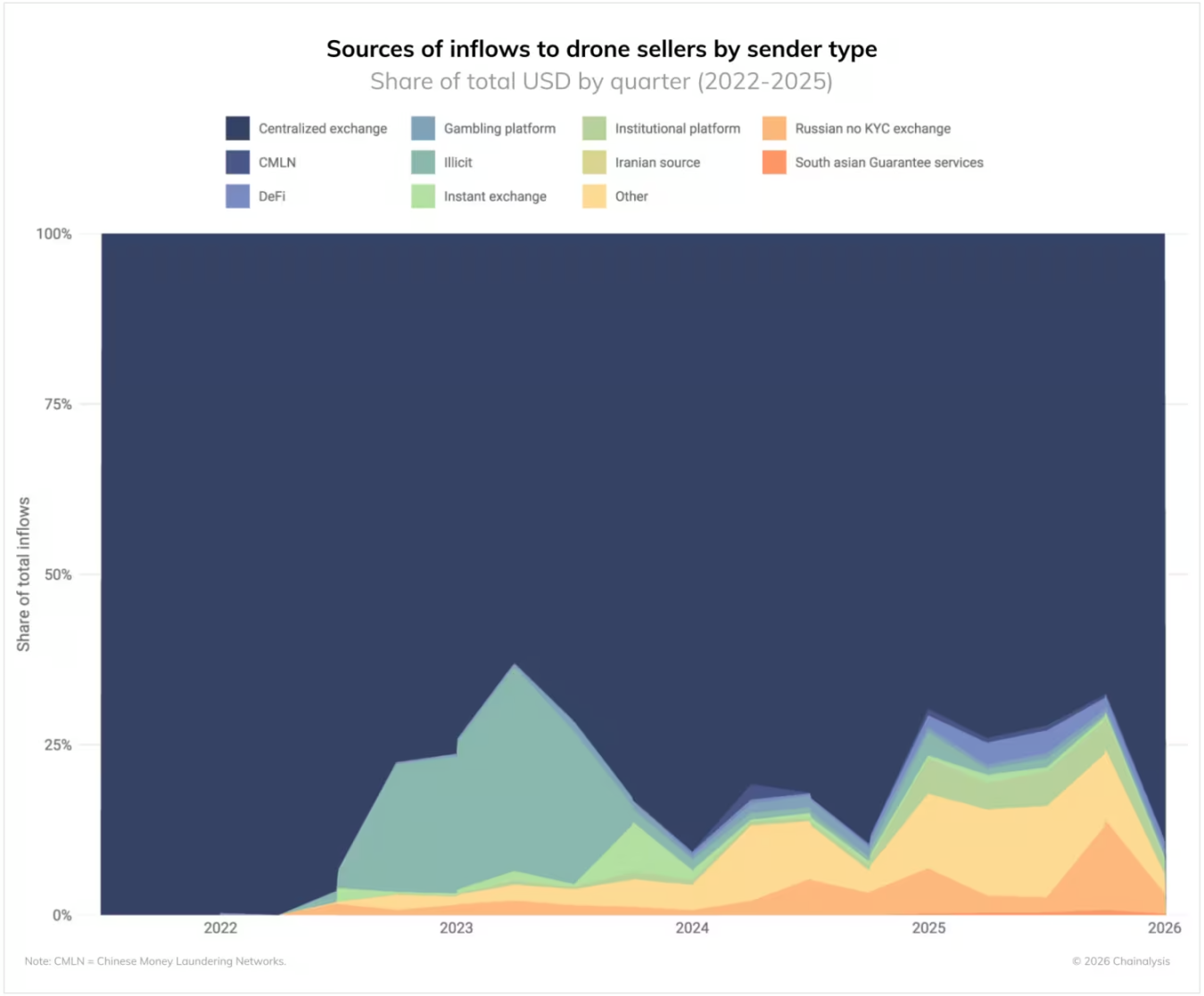 KB Vostok 的案例不仅揭示了某一家制造商的行为模式,更提供了一个范例,说明如何通过分析链上无人机供应商的资金流动,来发现更广泛的采购网络。通过分析流入供应商钱包的流动性来源,调查人员可以对买家的身份及运营地点提出合理假设。来自俄语无 KYC 交易所的资金暗示买家可能与俄罗斯有关;来自与伊朗关联服务的资金则暗示买家可能与伊朗有关。