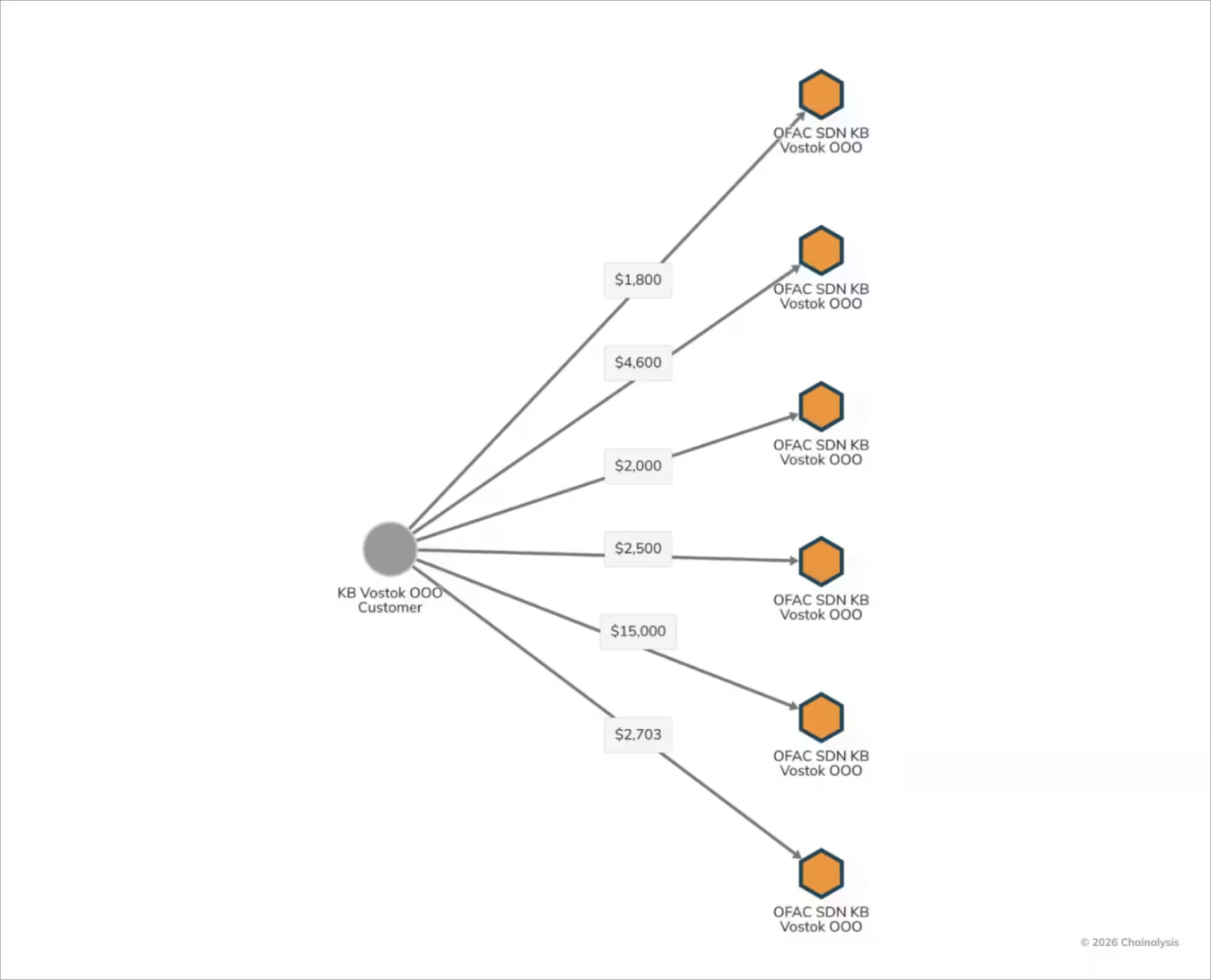 KB Vostok 使用稳定币而非比特币进行交易,同样具有重要的分析价值。这反映出非法加密金融领域的一个更广泛趋势,即转向使用与美元挂钩的加密货币。此类加密货币具有价格稳定性,更适用于商业采购。仅关注比特币流向的调查人员将完全忽略这一层面的活动。