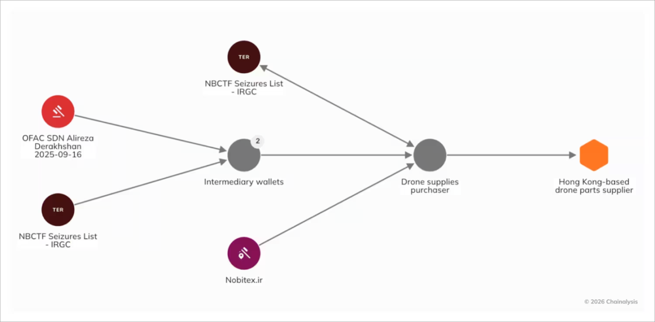 利用区块链技术追踪无人机采购活动,代表了一次具有实际意义的进步。每一个供应商地址都成为一个调查锚点。通过区块链分析,可以从这些固定点出发,绘制交易对手关系图,追踪流动性来源,并在原本不透明的采购网络中识别出此前未知的节点。