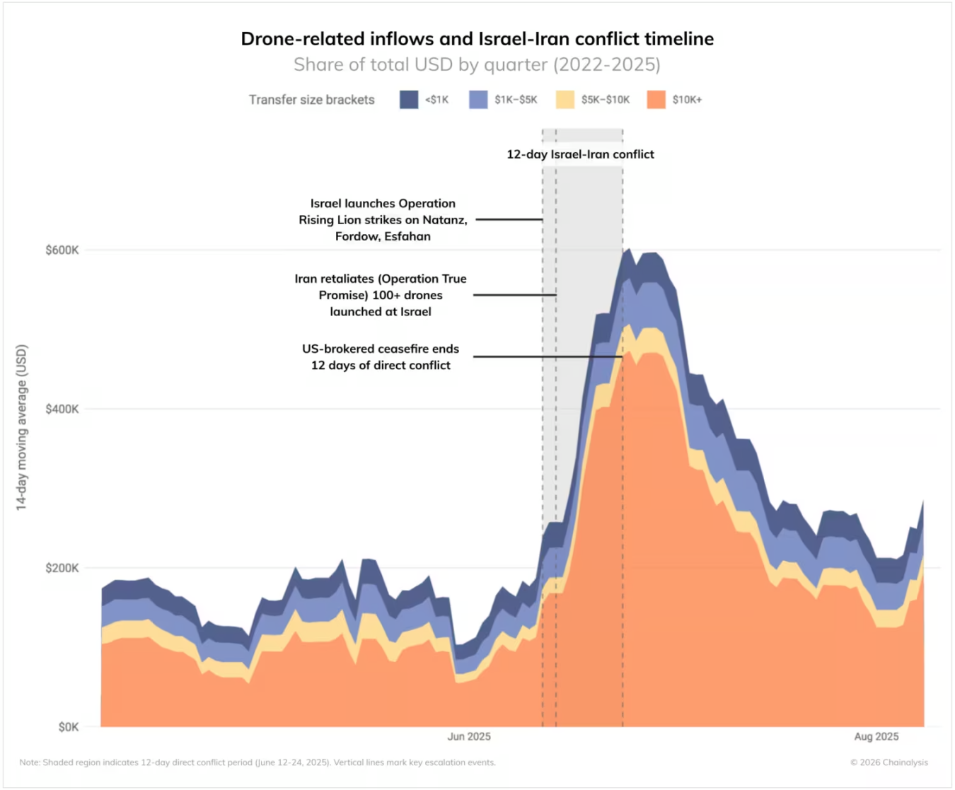 在此背景下,对与无人机相关的交易活动进行实时监控,包括在冲突活跃时期进行监控,具有重要的参考价值。如下图所示,在 2025 年 6 月伊朗与以色列之间为期 12 天的冲突期间,流入一小部分无人机供应商的资金出现激增,并在停火达成后恢复到冲突前水平。尽管这一现象与战争期间无人机相关采购增加的趋势相符,但它仅反映了特定时间点、有限供应商范围内的活动情况,不应被视为伊朗全部无人机支付格局或更广泛全球模式的代表。