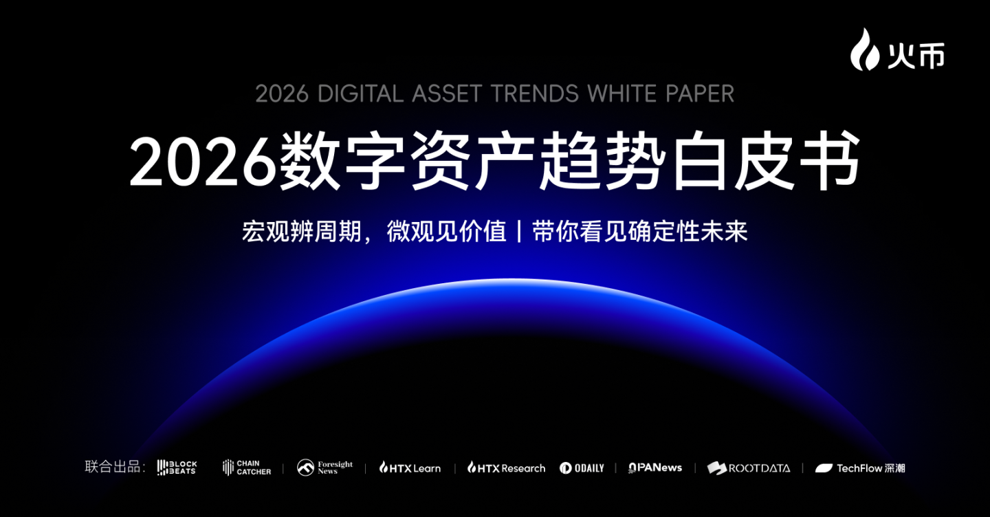 近日,火币 HTX 正式发布《2026 数字资产趋势白皮书》(以下简称「白皮书」)。本白皮书联合 Foresight News、BlockBeats、ChainCatcher、HTX Learn、HTX Research 、Odaily、PANews、RootData、TechFlow 等多家行业机构与媒体共同发布。在当前市场行情阶段性低迷、行业情绪趋于谨慎的背景下,这份长达万字的深度报告应运而生,旨在从结构性视角重新审视数字资产的发展路径,为市场提供前瞻性判断与系统性框架,帮助投资者在不确定周期中建立长期信心与认知锚点。