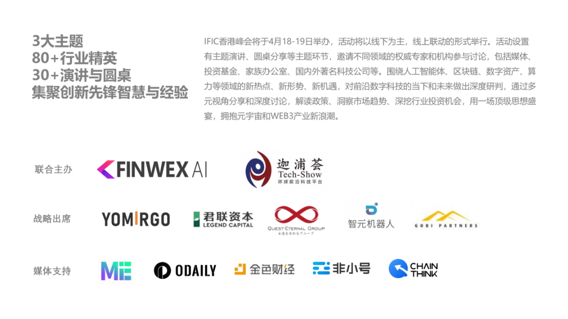 IFIC 香港峰会将于 4 月 18-19 日举办,活动将以线下为主,线上联动的形式举行。活动设置有主题演讲、圆桌分享等主题环节,邀请不同领域的权威专家和机构参与讨论,包括媒体、投资基金、家族办公室、国内外著名科技公司等。