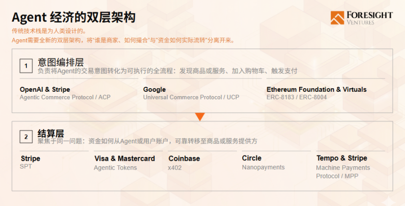 这场基础设施之争不会由单一协议主导,而是正在形成清晰的双层架构。意图层定义「谁是商家、如何撮合」,结算层定义「资金如何实际流转」。两层相互独立、各自演化,但缺一不可。缺失任何一层,Agent 经济的商业闭环均无法实现。
