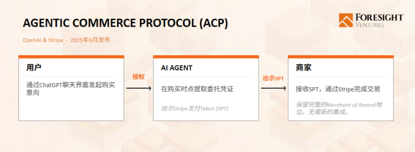 ACP 由 OpenAI 与 Stripe 于 2025 年 9 月联合发布。其核心机制为委托支付:用户在确认购买时将支付权限授予 Agent,Agent 通过符合 Delegated Payment Spec 的支付凭证完成交易,商家保留 Merchant of Record 地位。目前 Stripe 的 SPT 是该体系首个且唯一落地的方案。