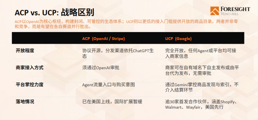 核心差异在于 Google 刻意规避中间商角色。其无需拥有交易本身,只需掌控商品发现这一上游环节。ACP 与 UCP 并非竞争关系,而是代表两种不同的市场主张:前者以封闭生态换取极致用户体验与掌控力,后者以开放标准换取更大规模效应与互操作性。