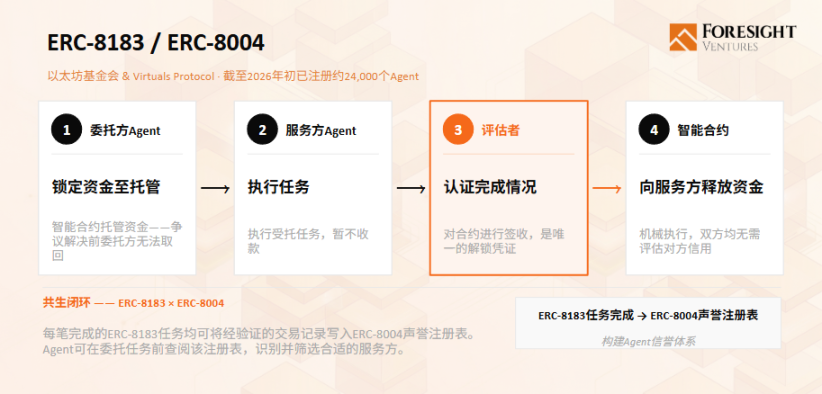 ERC-8183 由以太坊基金会 dAI 团队与 Virtuals Protocol 于 2026 年 3 月合作推出。每个 Job 由 Client(委托方)、Provider(服务提供方)、Evaluator(评估者)三方构成,资金由智能合约托管至任务验收完成。交易方无需互信,只需信任合约本身。ERC-8004 为配套身份协议,每个 Agent 在链上注册后基于历史交易积累声誉评分。目前全网已注册约 24,000 个 Agent。
