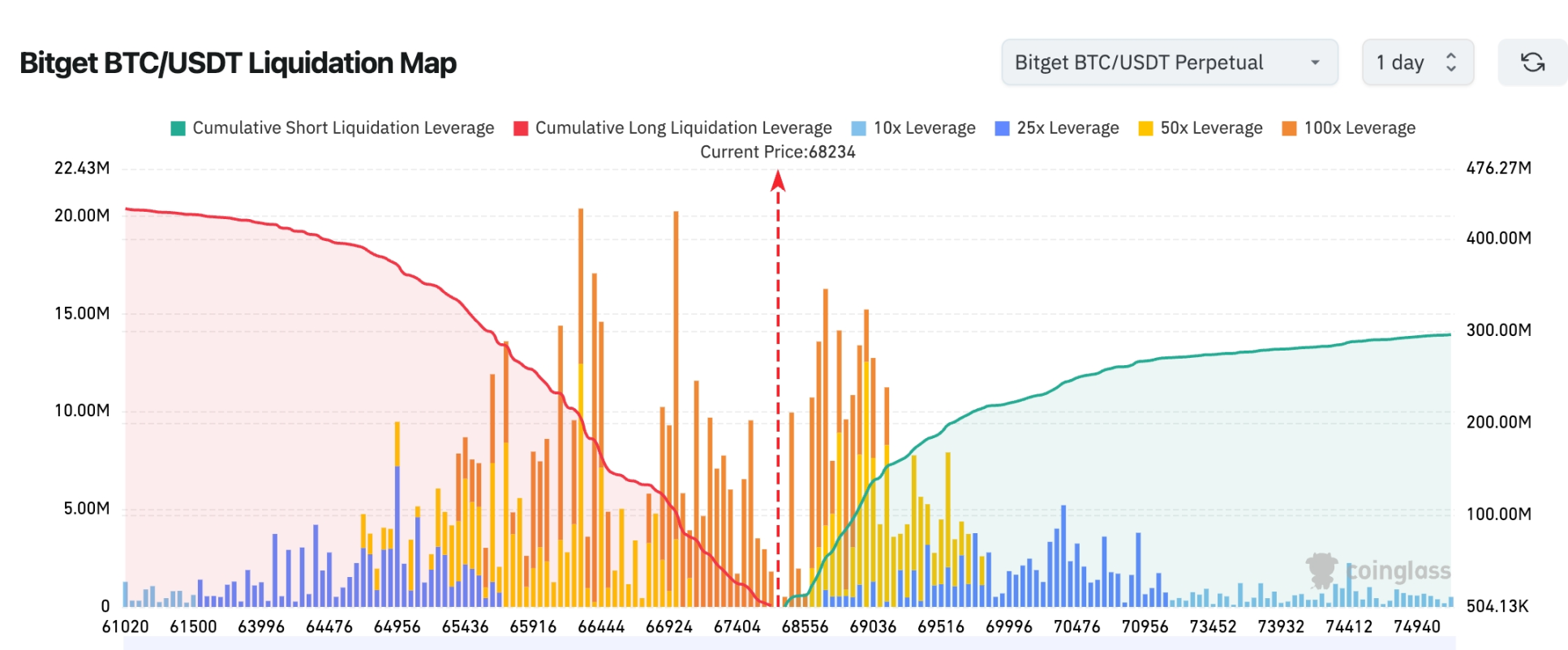 Bitget BTC/USDT 清算地图:当前价格约 68234,已经逼近 68500–69000 上方多单清算密集区,且 50x–100x 高杠杆分布明显,一旦继续上冲容易触发多头连锁爆仓。下方 67000–67500 形成相对强支撑,而上方压力显著增强,短期更可能在 68000 附近震荡后再选择方向,关键观察是否放量突破 69000。