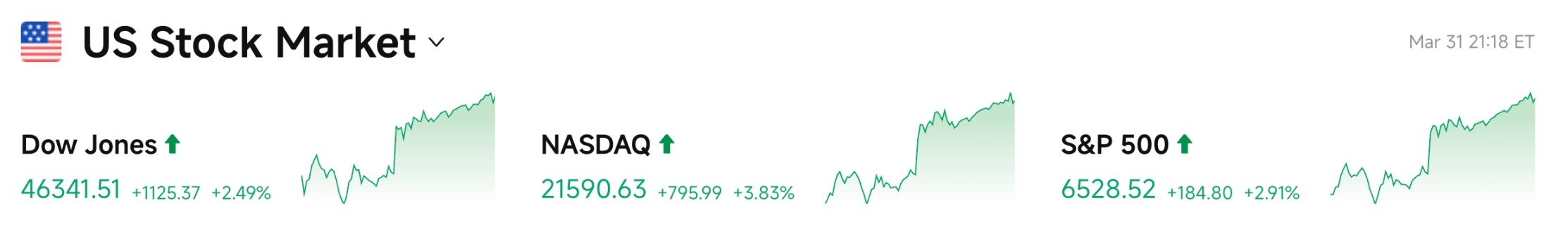 道指:涨 1125.19 点,报 46341.33 点,涨幅 2.49%,创去年 5 月以来最大单日涨幅。