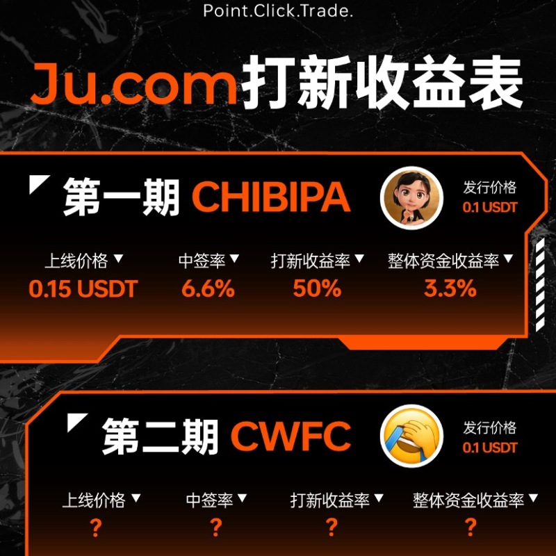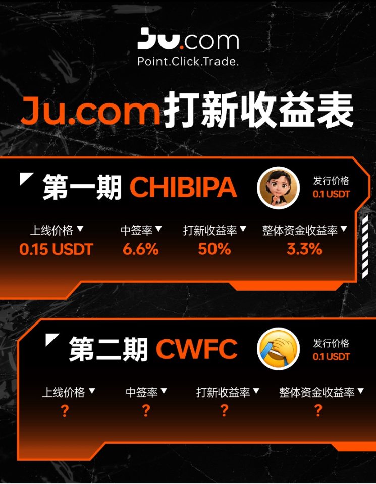 昨日,Ju.com「第二轮 Meme 十期打新计划」首期项目 CHIBIPA 完成认购与 TGE。据平台披露,本期参与人数超 4.2 万人,认购总金额近 1.43 亿 美金。中签率为 6.6%,上线后价格为 0.15 USDT,单币收益率为 50%,整体资金收益率为 3.3%。