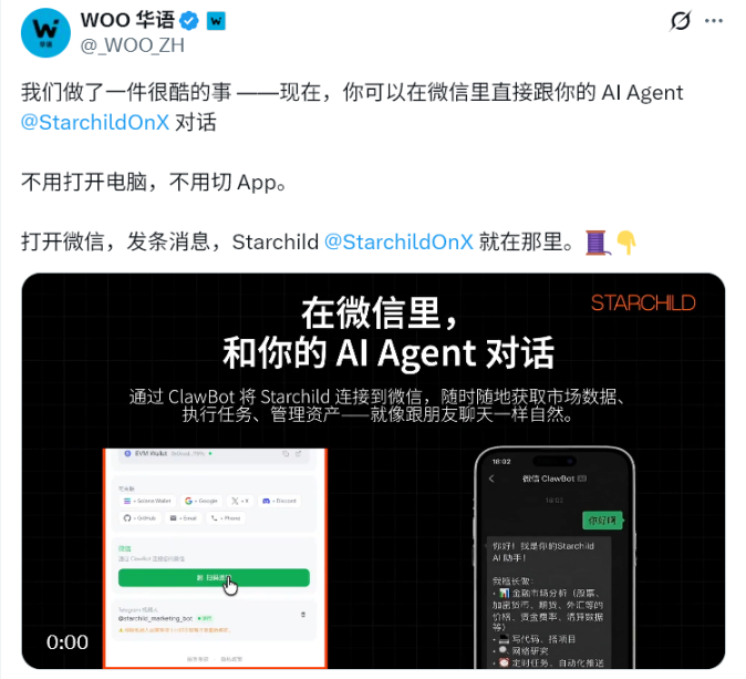 WOO 给出的答案,是把这套能力打包好,送进微信。近日,WOO 旗下 AI Agent 平台 Starchild 宣布接入微信 Clawbot,扫码绑定后,用户可以直接在微信里完成信息查询、任务执行、自动化设定等操作,同步上线微信支付购买 Credits。这是 Starchild 自今年 1 月发布以来的第六次重大更新。