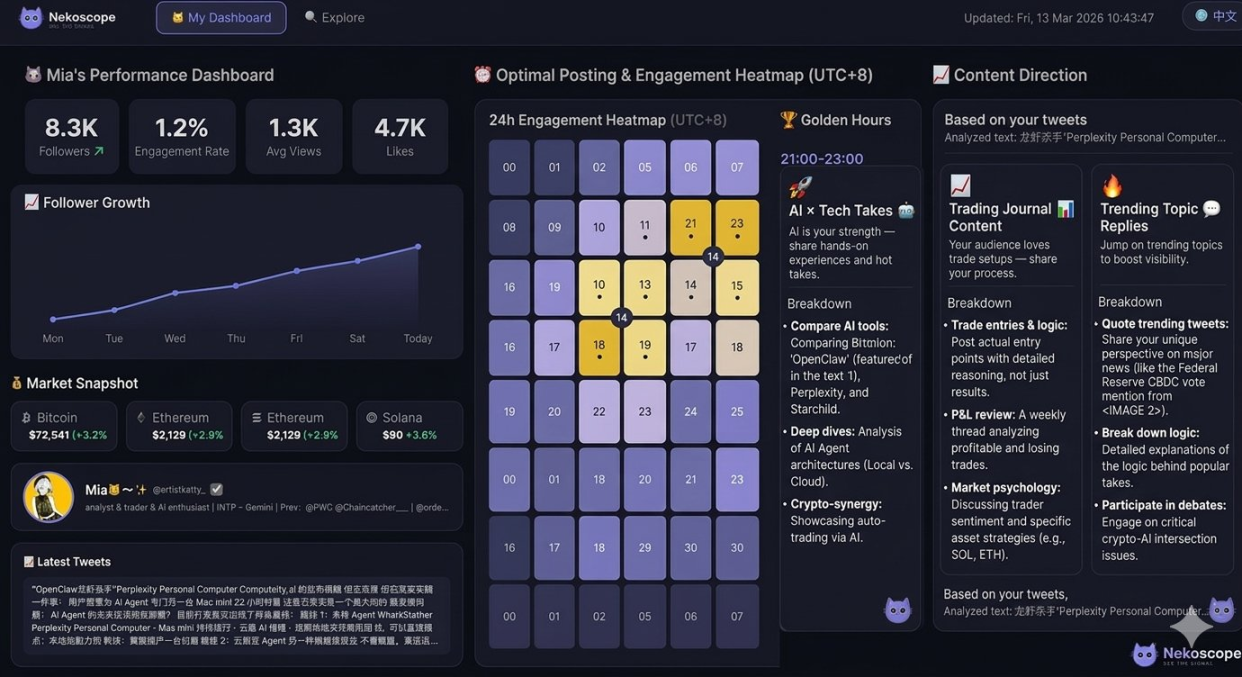 零代码构建与部署:得益于此,Starchild 用户用自然语言对话,在 2 小时内从零搭出了一套实时推特数据分析平台,支持分析 X 账号互动数据、最佳发文时间建议、基于历史帖子的 AI 图文创意推荐。
