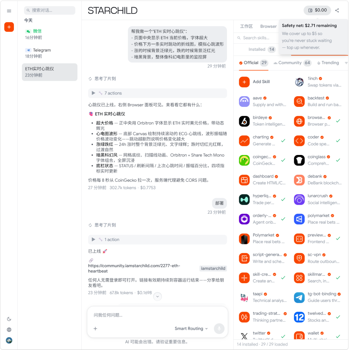 传统聊天 AI 只能输出文字、图片或代码,而 Starchild 是具备执行能力的个人 AI 助理。交易者用它盯仓报警,研究员用它抓取聚合信息,开发者用它写代码部署项目,普通用户用它搭建自己的自动化工作流。