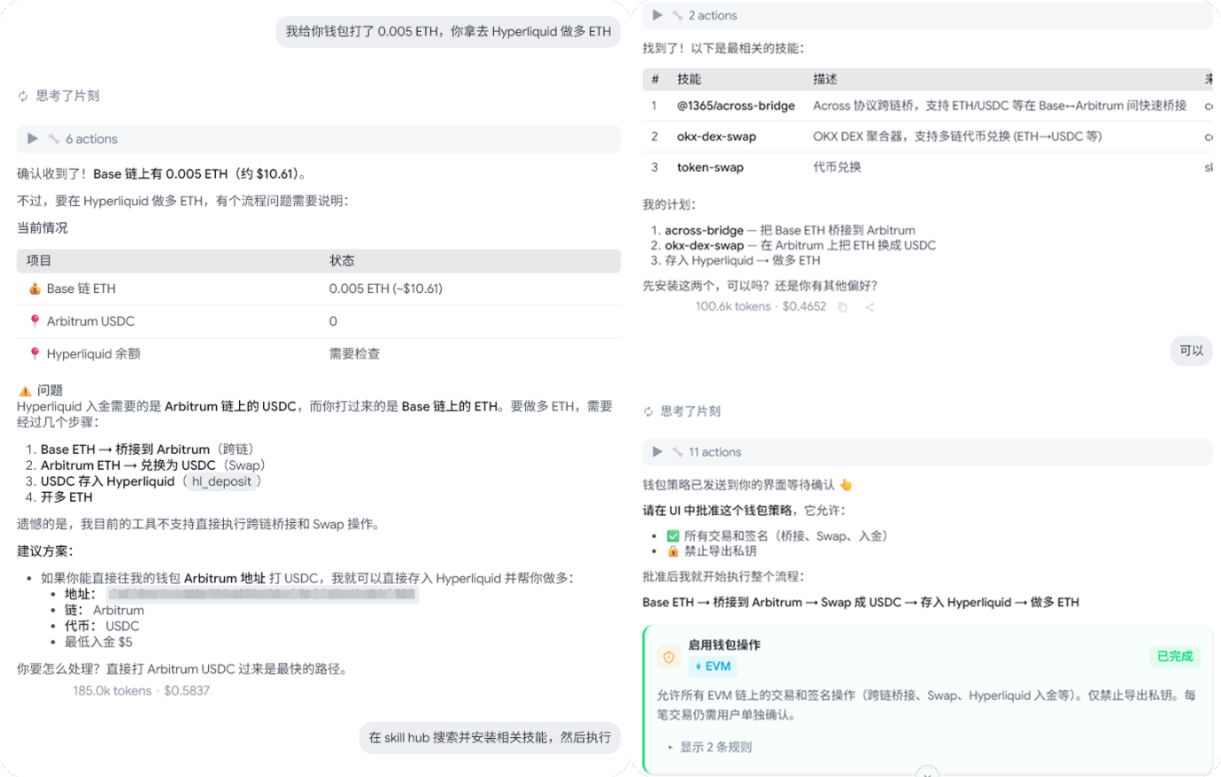 ▲ Starchild 搜索并安装 Skill,完成跨链 → Swap → 存入 Hyperliquid 并做多 ETH