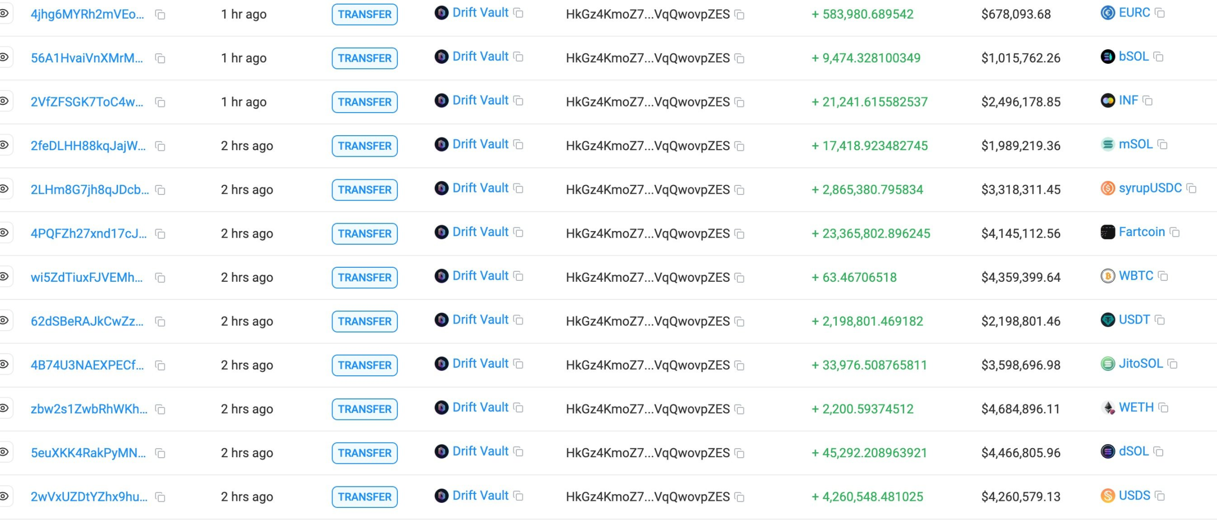 此次攻击从 4 月 2 日凌晨开始。链上监控平台 PeckShield 发出警报:Drift 主金库地址开始向一个新创建的钱包 HkGz4K 大规模转账。首批转出的主要是 JLP(Jito Liquidity Provider)代币,价值约 1.55 亿美元,随后是 USDC、SOL、cbBTC、wBTC、WETH 以及部分 meme 币。