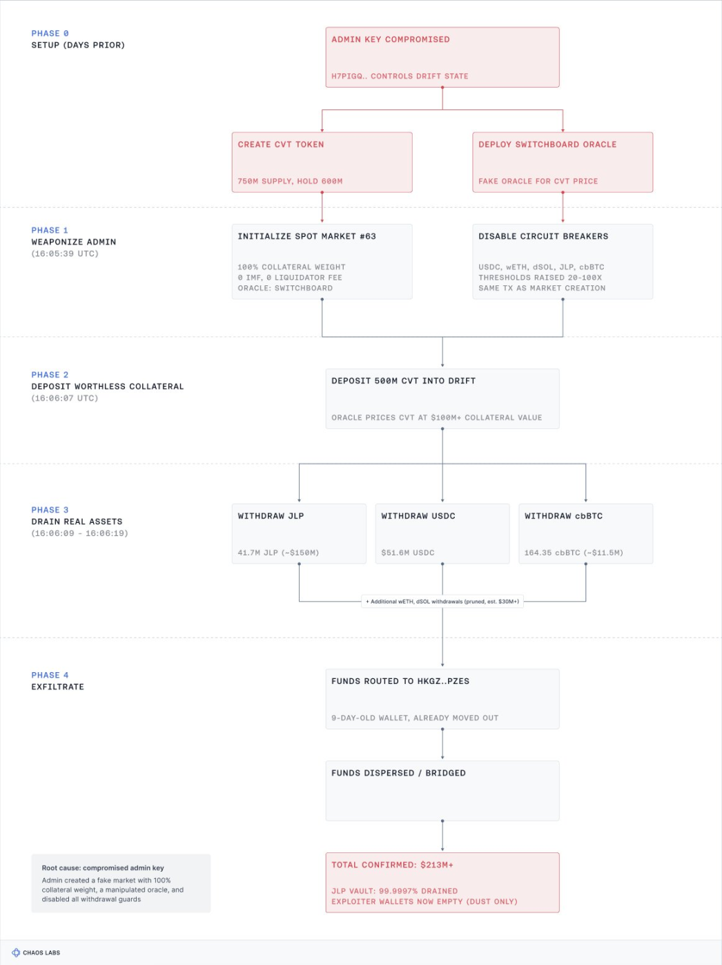 本次黑客攻击 Drift 事件,从现货市场创建开始,在单一交易中,攻击者调用 InitializeSpotMarket 创建了 CVT 的现货市场#63,并设置了极端参数。这些参数允许攻击者存入无价值代币并获得完全、无限的借贷能力。同时,在同一交易中,攻击者将 5 个真实资产市场的电路断路器提升 20 倍,包括 USDC、wETH、dSOL、JLP 和 cbBTC,从而确保后续大额提款不受阻挡。