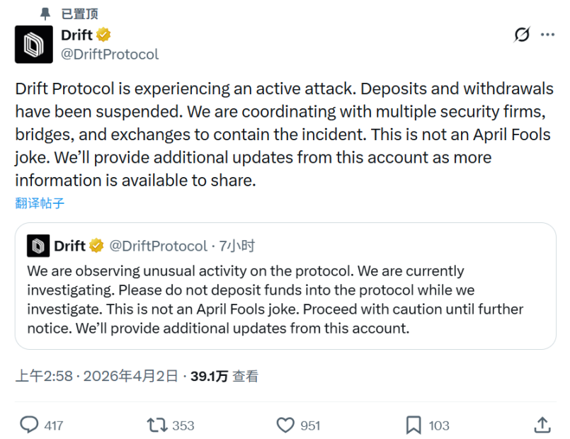 4 月 2 日,Drift Protocol 在 X 平台上连发两条公告,先是「观察到协议异常活动,正在调查,请勿存入资金」,随后直接确认「正在遭受主动攻击,存款和提现全部暂停」。