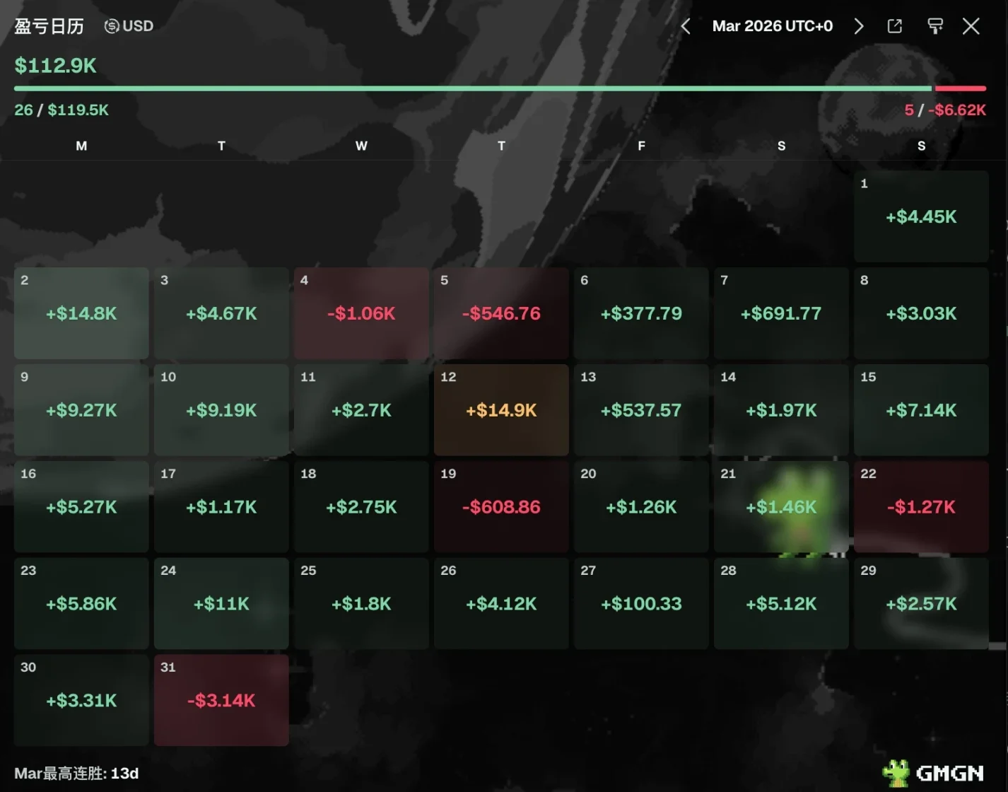 入圈一年,Jerry 已是 BSC 上一位小有名气的 Meme 玩家。据 GMGN 数据,Jerry(ID:金狗吊车)在 30 日牛人榜中排名第 12 位,3 月份其累积赚取了 11.29 万美元,其中仅有 5 天亏钱,最高连胜 13 天,单天最高盈利达 1.49 万美元。