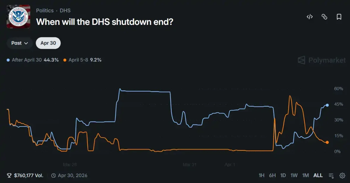 目前 Polymarket 上已有相关事件:「DHS 停摆将于___结束」。截至发稿时,4 月 5 日至 8 日期间结束停摆的概率为 9%,停摆 4 月不会结束的概率为 44%。