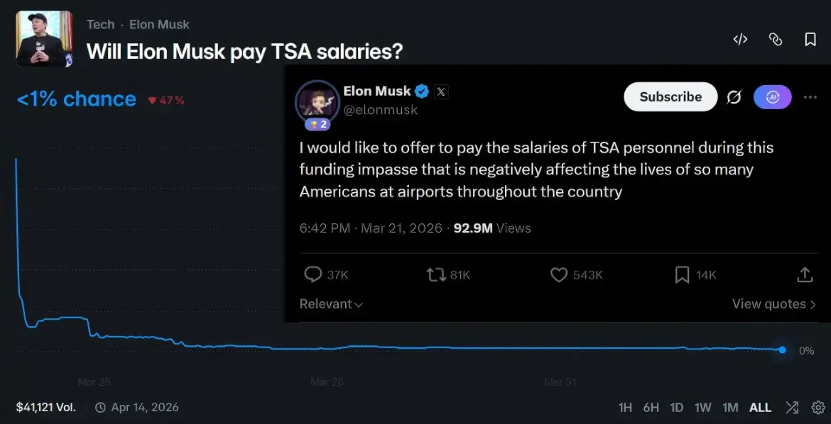 由于 TSA 员工持续离职导致各大机场延误严重,马斯克在 3 月 21 日发文表示愿意支付 TSA 人员的薪资,由此催生了 Polymarket 交易事件「马斯克是否会支付 TSA 员工薪资?」。
