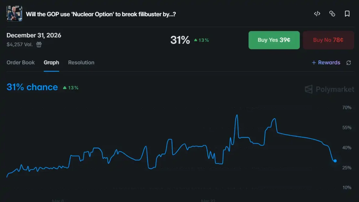 与本次政府停摆相关的另一个交易事件是「共和党是否会在 2026 年 12 月 31 日前使用『核选项』打破阻挠议事?」,目前概率为 31%。
