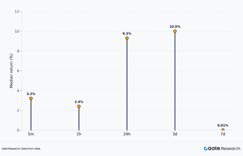 对于普通用户而言,真正决定参与体验的,并不是有没有一两个涨幅非常夸张的“神币”,而是平台整体新币质量是否足够整齐、是否具有一定可重复性。从中位数数据来看,Gate Q1 至少在 24 小时到 3 日这一阶段,给出了比较清晰的答案:平台现货上币具备较强的一致性和一定的正向期望。