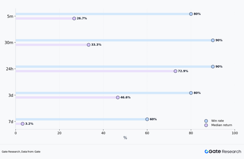 Q1 新上线项目的中位数涨幅分别为:5 分钟 +3.2%,1 小时 +2.4%,24 小时 +9.3%,3 日 +10.0%,7 日 +0.01%。即使将极端高倍项目的影响放在一边,仅从样本中典型的项目表现来看,Gate 新币在 24 小时和 3 日阶段依然呈现出较明确的正收益状态,即 Gate 现货上币这一季度的整体表现,并不是只依靠极少数案例将平均值拉高,而是大多数项目在上市后的核心观察窗口中都具备一定正向收益基础。