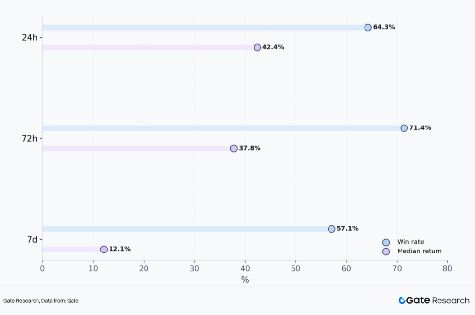 从胜率看,独家项目在 24 小时、72 小时和 7 日维度的上涨成功率分别达到 64.3%、71.4% 和 57.1%。其中,72 小时窗口表现最为突出。也就是说,在上市后第 2 天到第 3 天这段时间里,Gate 独家项目并没有随着开盘热度消退而迅速走弱,反而形成了更清晰的市场资金承接和上涨效应。