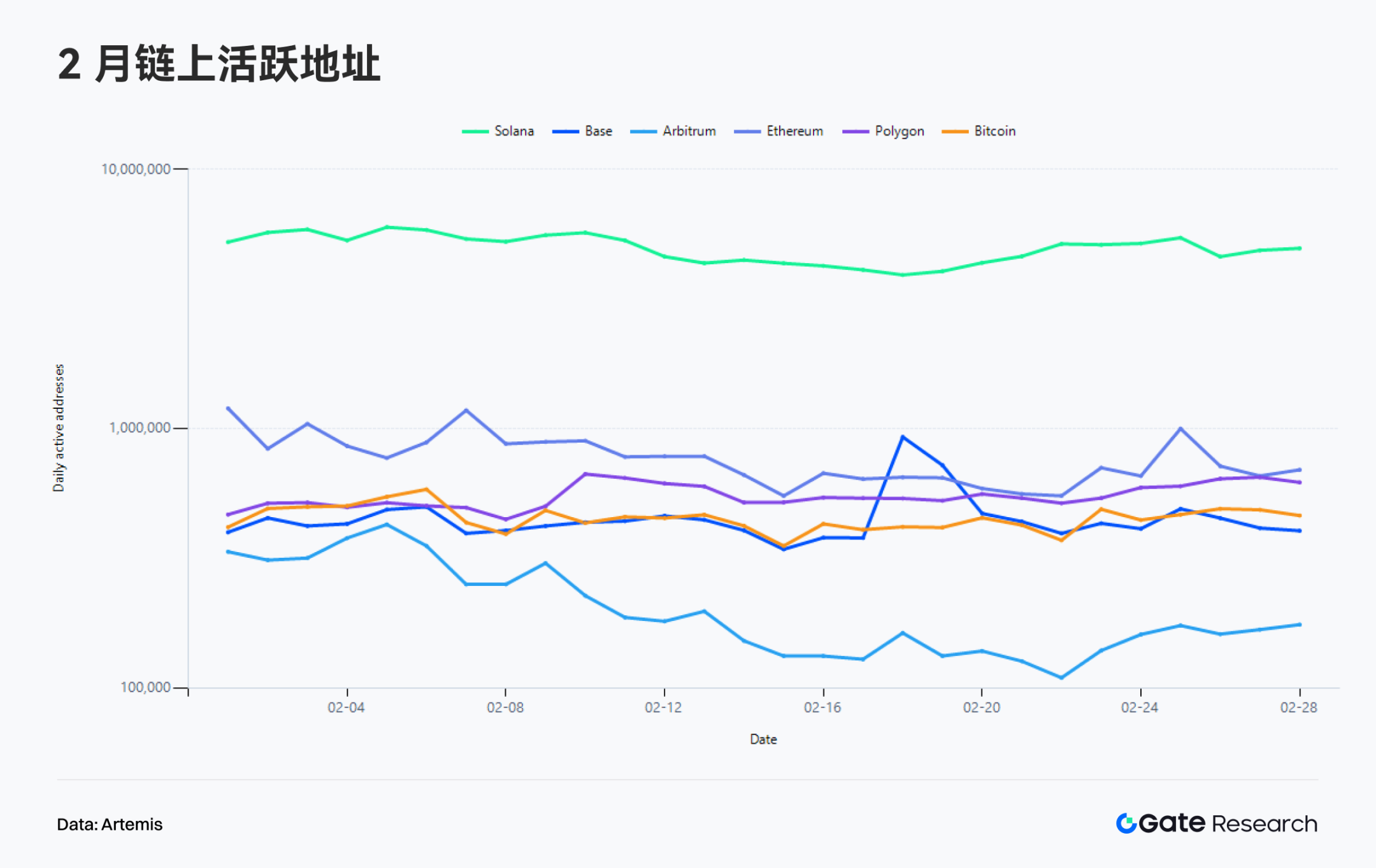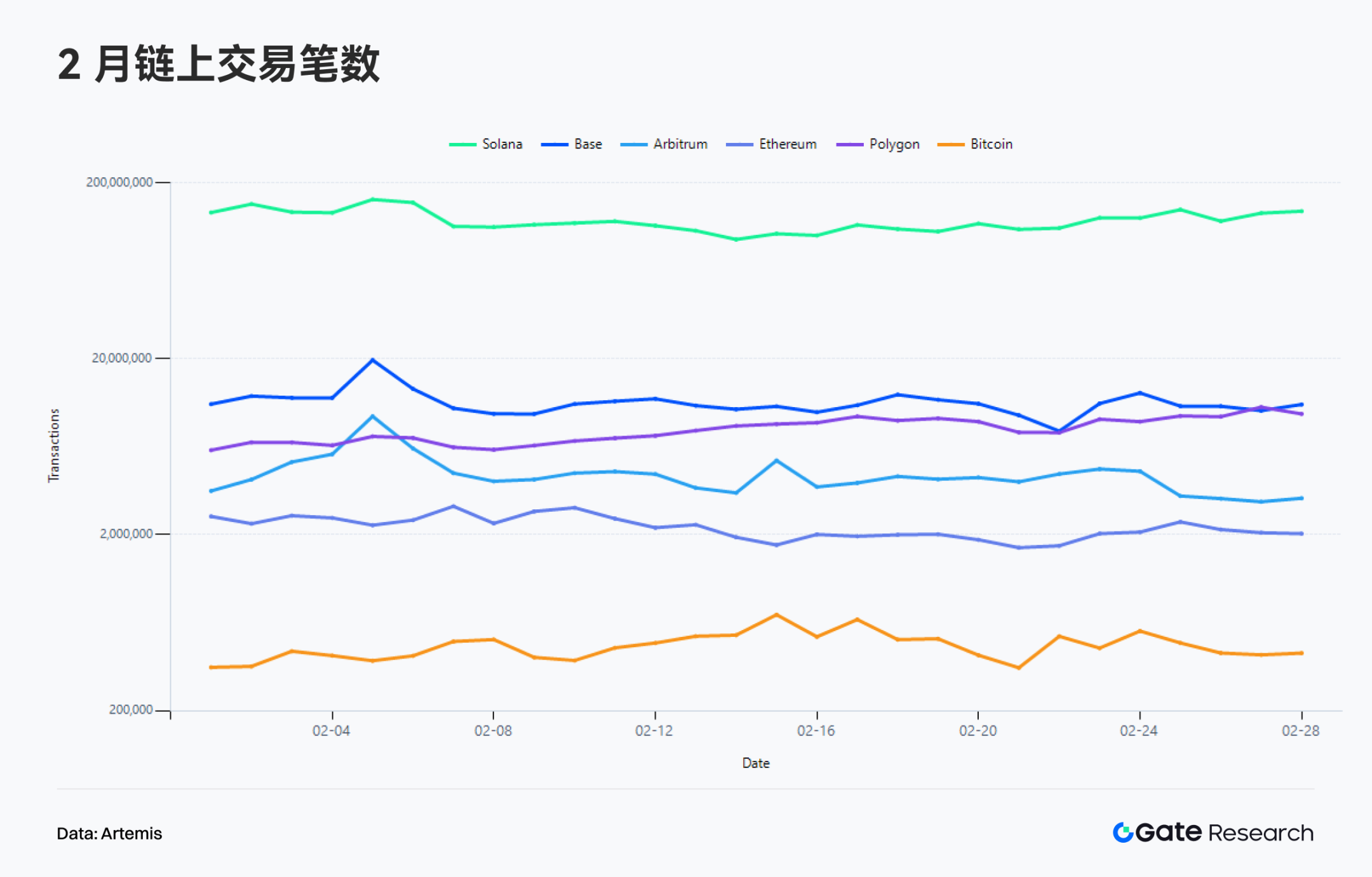 整体来看,2 月,Solana 维持绝对高频,Base 与 Polygon 继续扩张,Arbitrum 活跃修复但粘性不足,Ethereum 坚守结算属性。