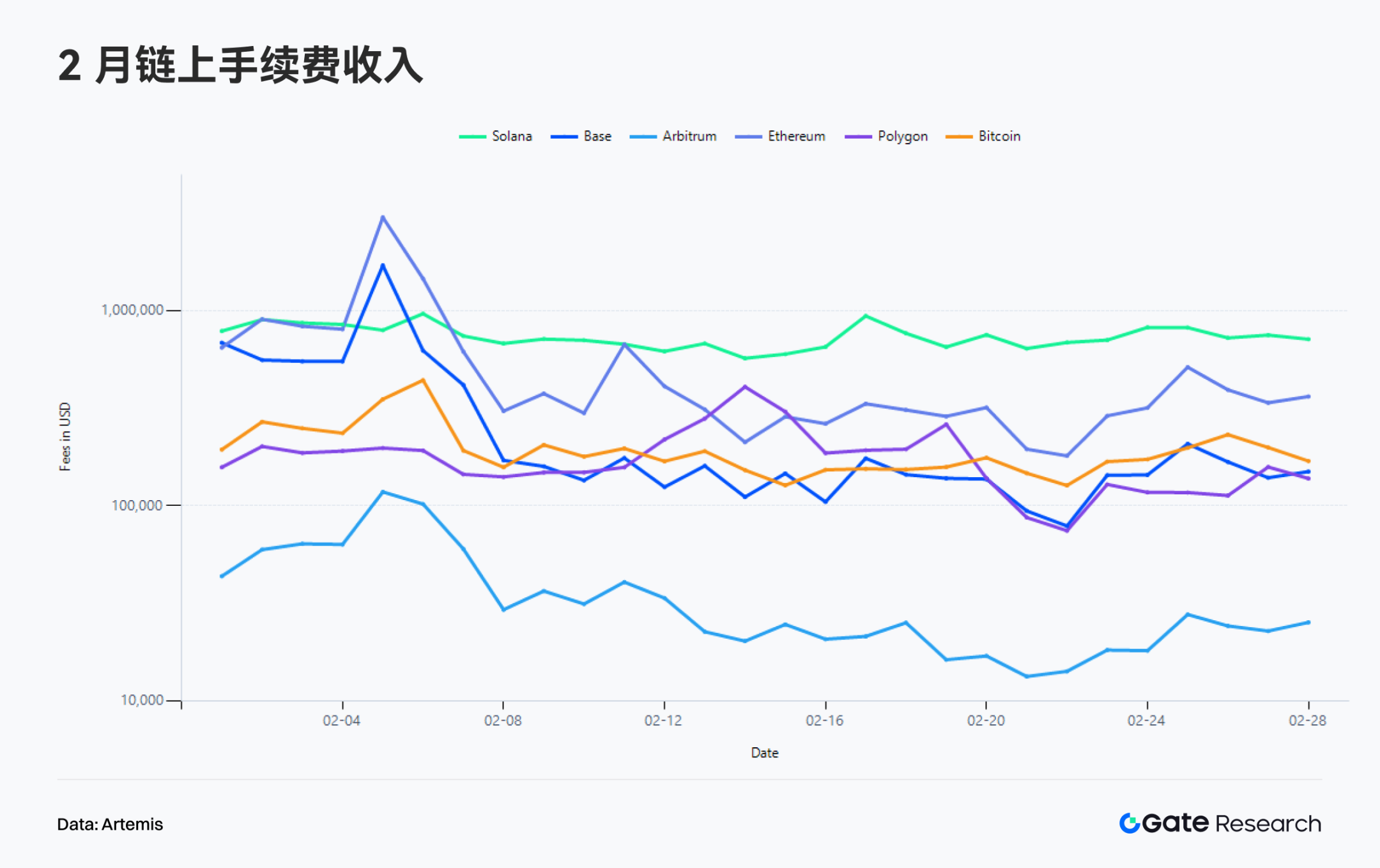 Base 的手续费扩张最值得关注。其 2 月日均手续费约 28.9 万美元,较 1 月提升约 53.7%,虽然月末回落明显,但整个月的价值捕获能力已经较 1 月显著抬高。Polygon PoS 同样从约 12.4 万美元升至 17.8 万美元,环比增长约 43.2%;Arbitrum 基本持平在 3.6 万美元附近;Bitcoin 则从约 23.2 万美元回落至 19.7 万美元。