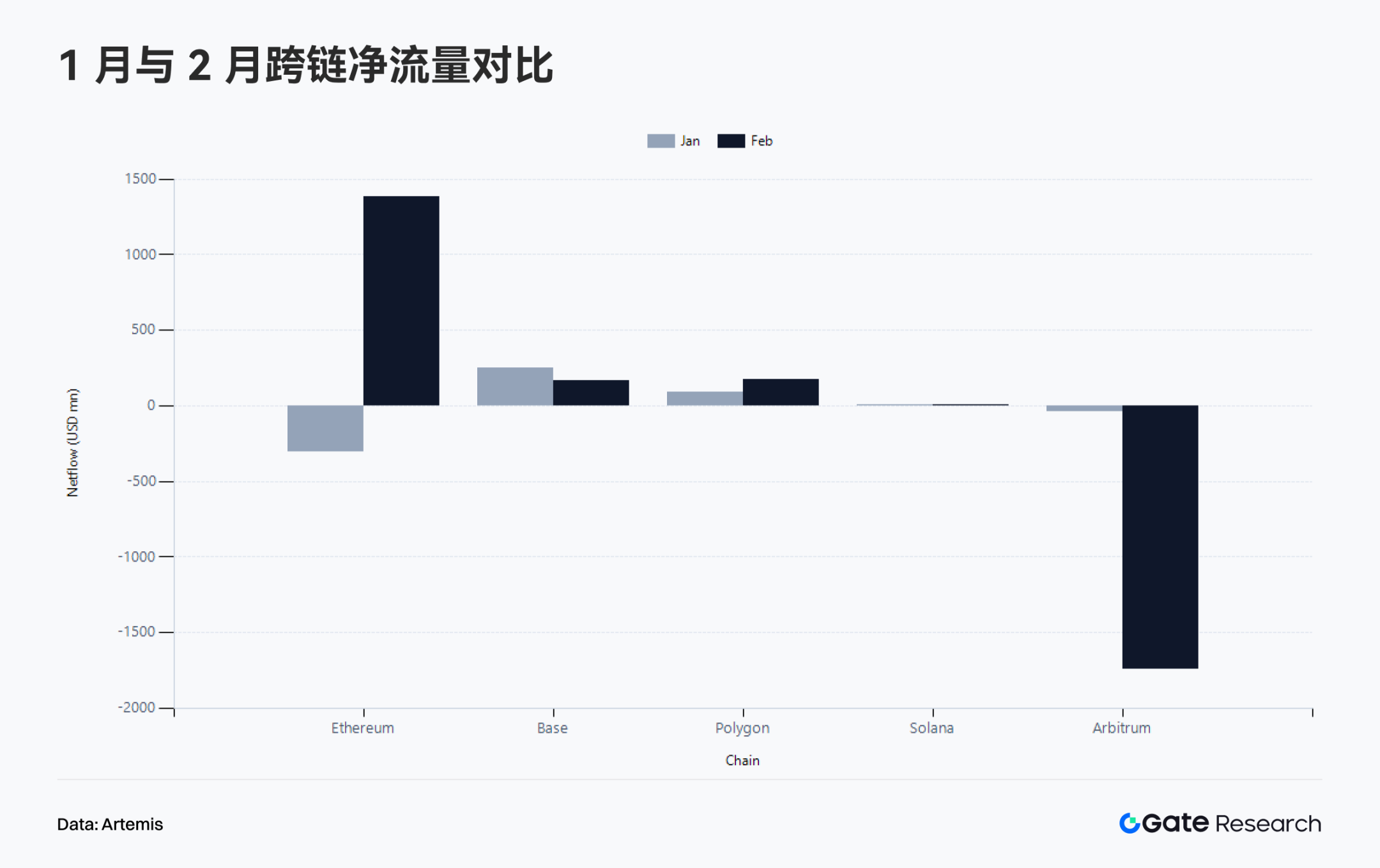 与此同时,Arbitrum 从 1 月约 4,101 万美元净流出急剧扩大至 2 月约 17.42 亿美元净流出,成为本轮最明显的失血链。Base 虽然仍保持净流入,但规模从 1 月约 2.53 亿美元收窄至 2 月约 1.70 亿美元,说明它仍在承接叙事资金,但独占注意力的阶段已经过去。Polygon PoS 的净流入则从约 9,007 万美元扩大至约 1.77 亿美元,Solana 也从约 359 万美元小幅抬升至约 921 万美元。整体上,2 月资金流向可以概括为从 Layer2 广谱扩散退回到更高确定性的主结算与宏观资产交易的高效率网络上,而这正是风险偏好降温后更成熟的资金行为。