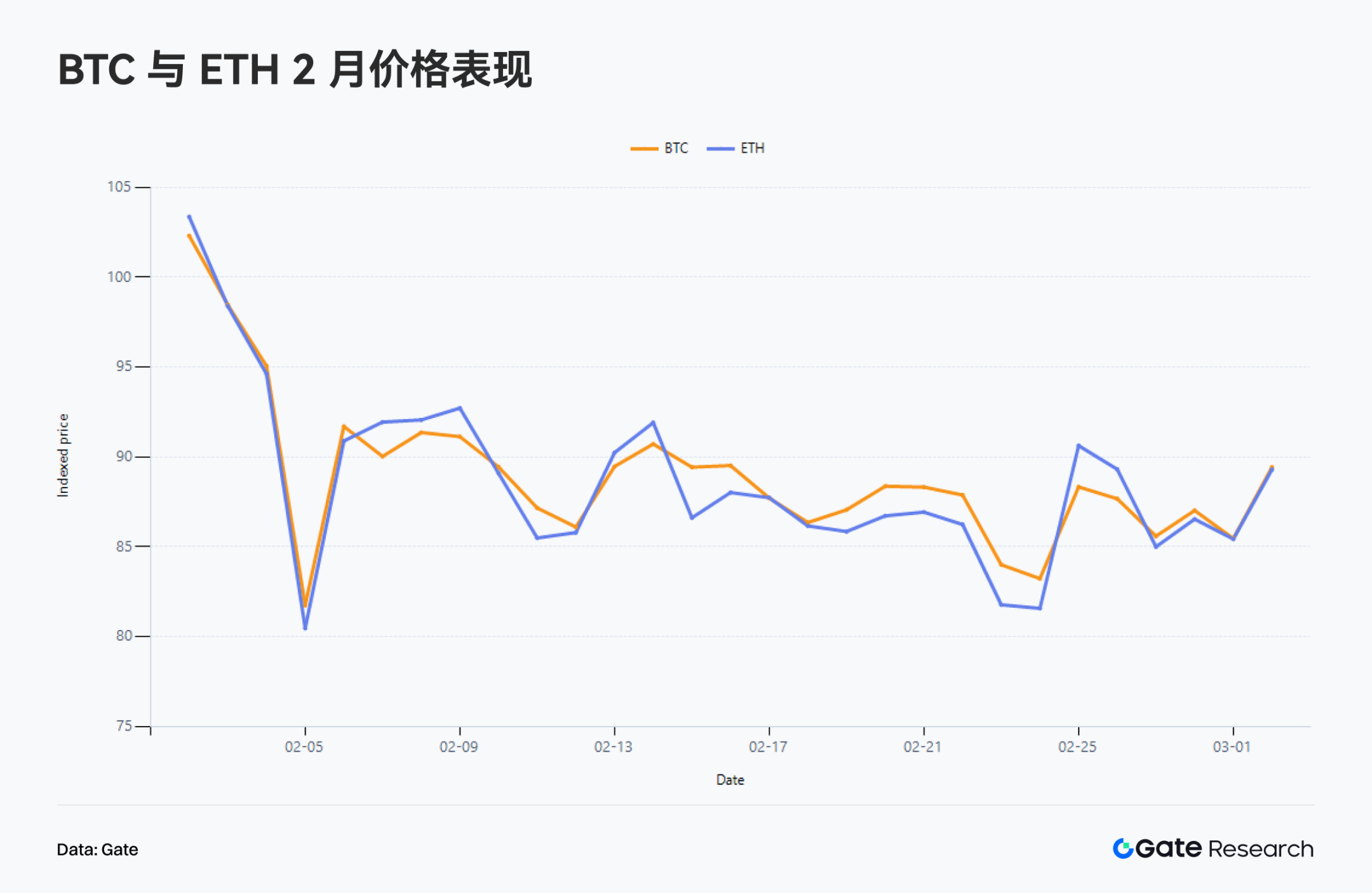 2 月 BTC 与 ETH 的价格结构同步走弱。以 2 月初为 100 的标准化表现来看,到月末 BTC 约降至 85.5,ETH 约降至 85.4,二者阶段跌幅都在 14.5% 左右,说明 2 月下跌是更广泛的风险资产回撤。区别在于,ETH 在弱势反弹中的弹性更差,而 BTC 的结构更像是高位回撤后寻找新的中期平衡区,这也与链上指标所反映的短期资金承压和长期结构仍未彻底破坏的状态相吻合。
