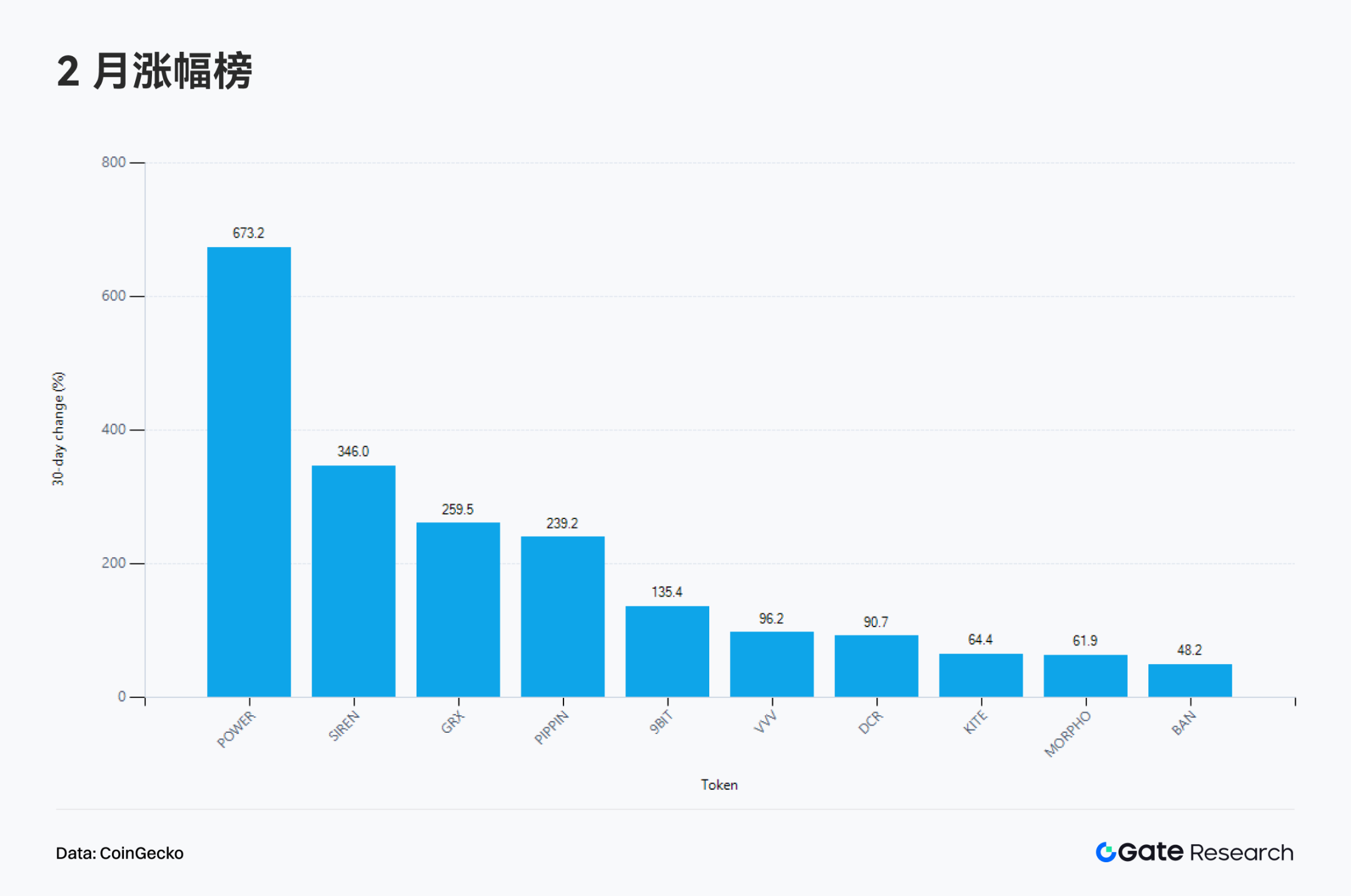 根据 CoinGecko 数据,2 月最强的十个代币并不是来自同一条叙事,而是集中体现为三类催化剂:AI Agent / Compute、供给侧收缩,以及机构化 DeFi。榜单头部的 POWER、SIREN、GRX 与 PIPPIN 都具有明显的供给冲击或 AI 叙事特征,而 MORPHO 则继续作为机构化 DeFi 代表进入前十。当 BTC 与 ETH 价格承压、主流大盘资产缺乏向上弹性时,资金并没有完全离场,而是从大盘 beta 转向更具结构性催化的叙事资产。