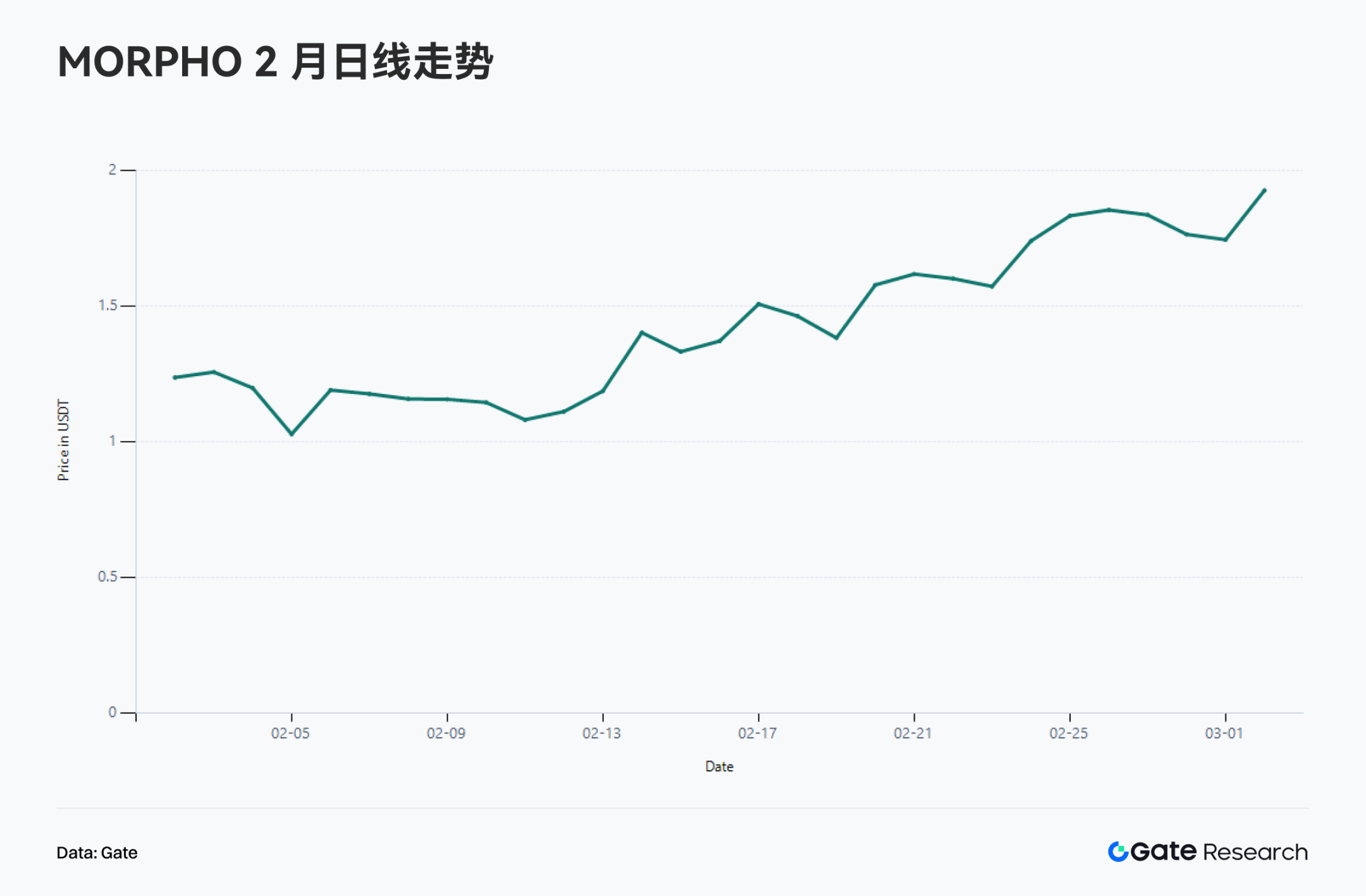 从 K 线结构看,MORPHO 在 2 月也并不是一根直线拉升,而是经历了月初回踩、月中加速及月末高位震荡的较完整趋势推进过程。价格中枢从 1.1 USDT 一线逐步抬升到 1.8-1.9 USDT 区间,资金并非一次性脉冲式涌入,而是沿着叙事确认、成交放大和中枢上移的节奏持续加仓。和纯 Meme 式单点爆发不同,这类走势更符合中期资金逐步重估一个赛道 beta 资产的典型特征。