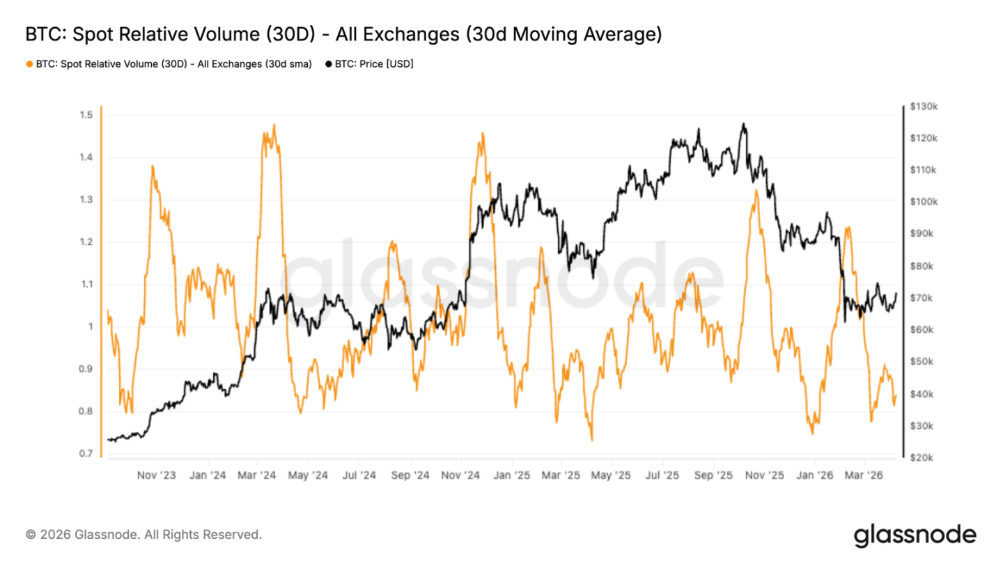 现货活动仍然疲软。币安的三十天相对交易量仍低于基准线,并在其区间低位附近徘徊。近期数据显示仅有小幅回升,但没有任何迹象表明参与度显著回归。